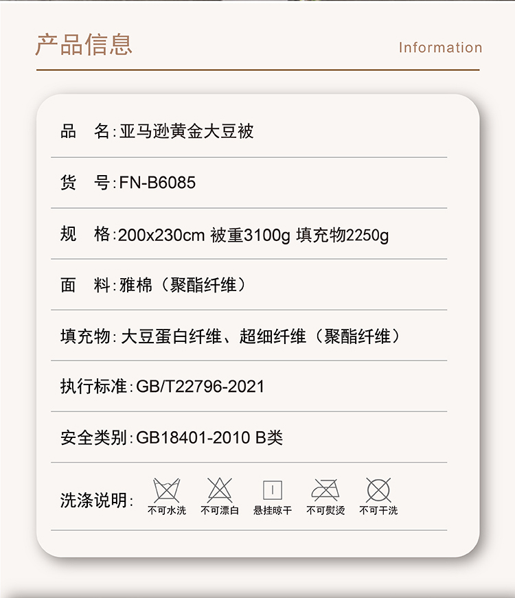 商品名称:faunen/芳恩亚马逊黄金大豆被200*230cm 3100g