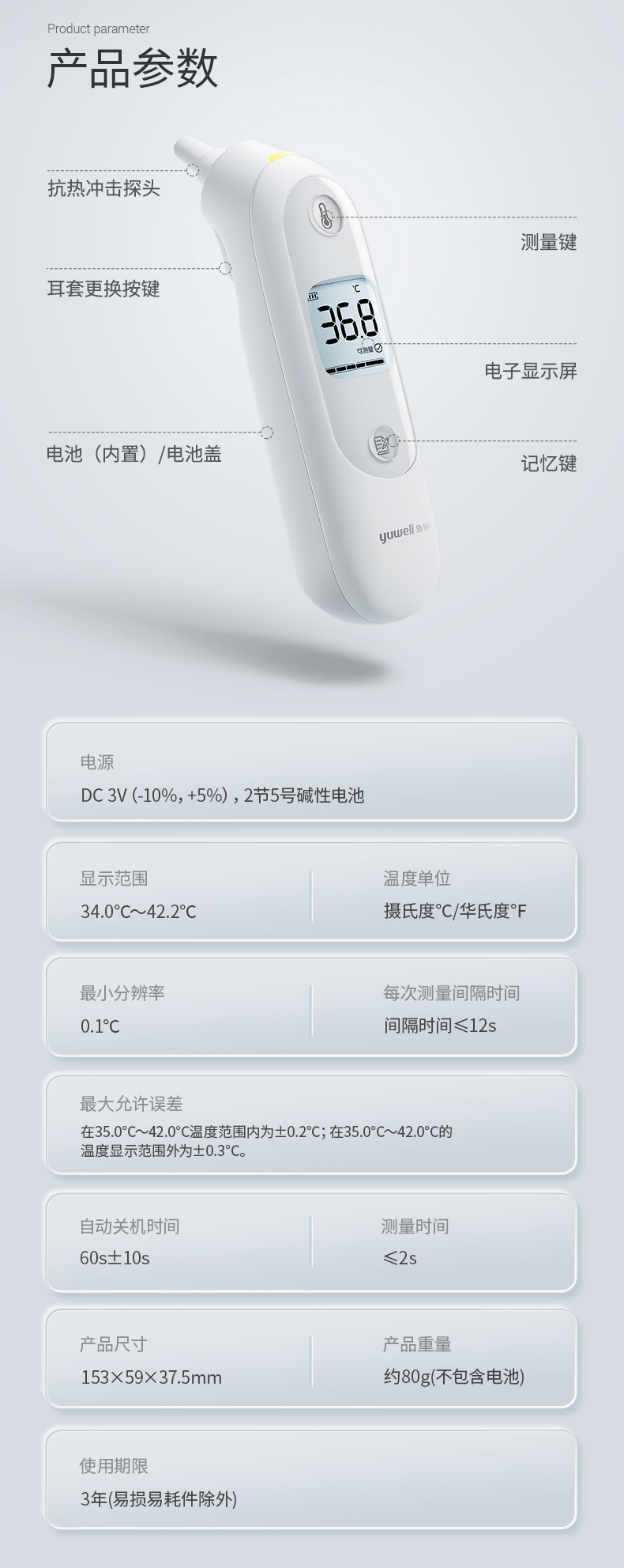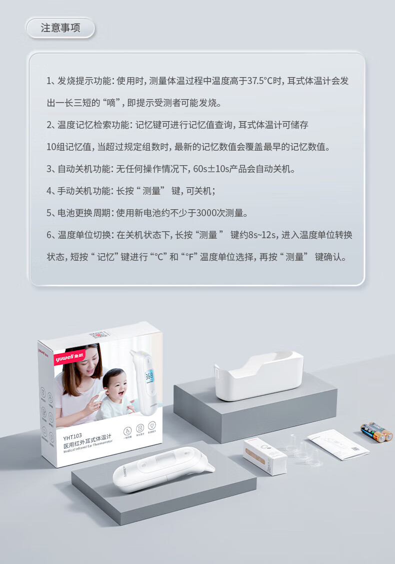 商品名称:【顺丰配送】yuwell/鱼跃医用红外耳式体温计YHT103