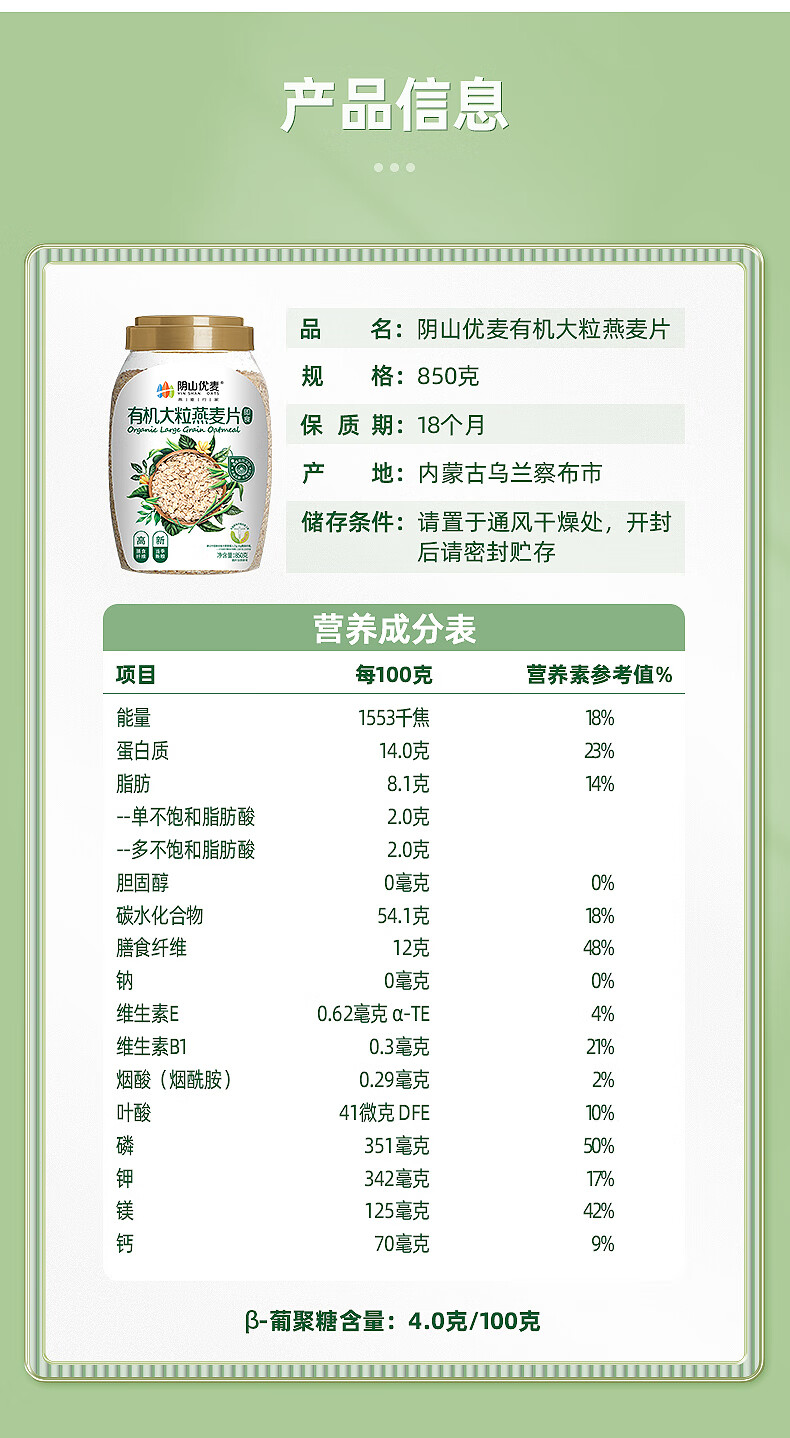 商品名称:YIN SHAN OATS/阴山优麦即食有机大粒燕麦片850g