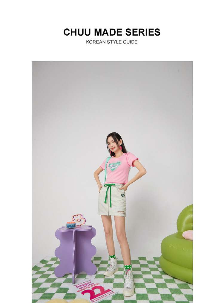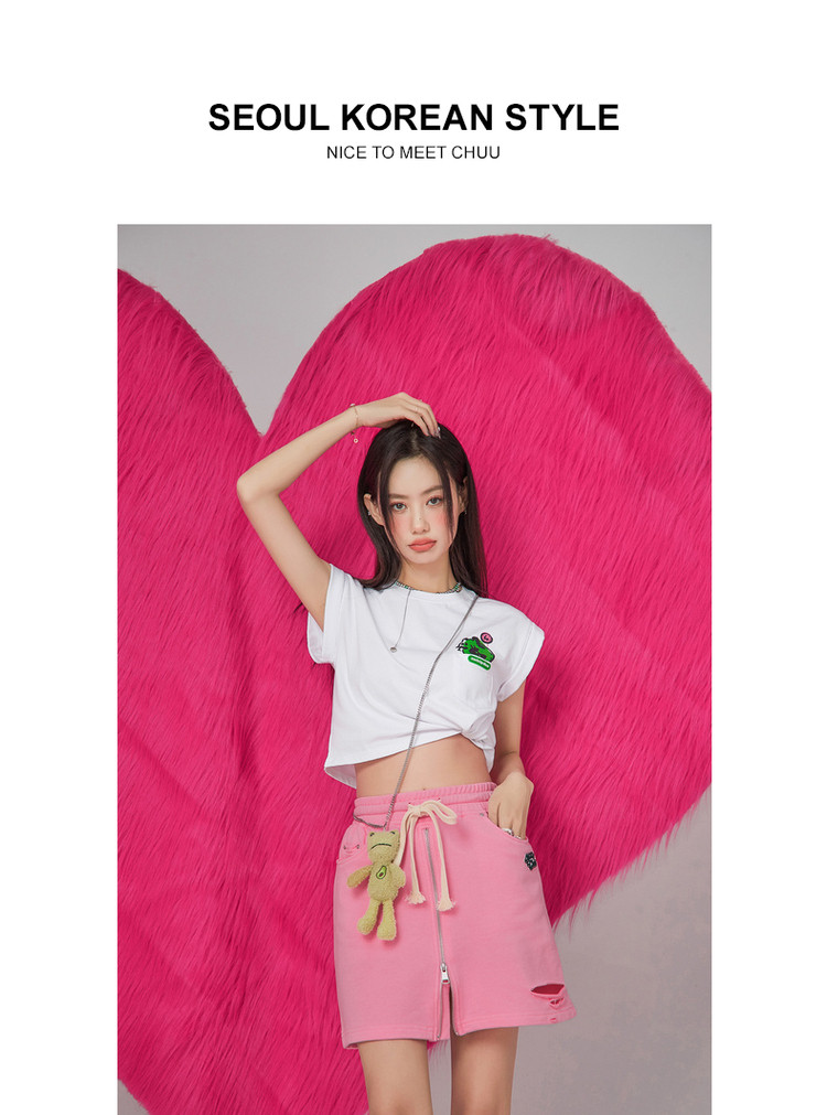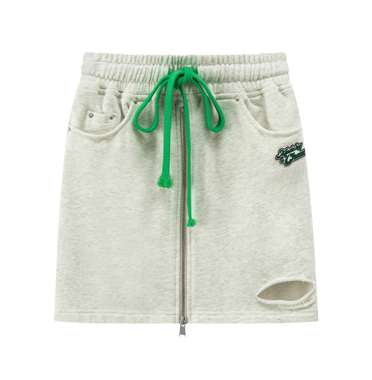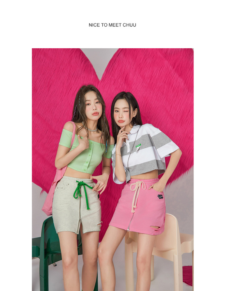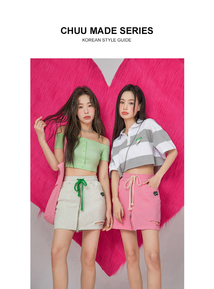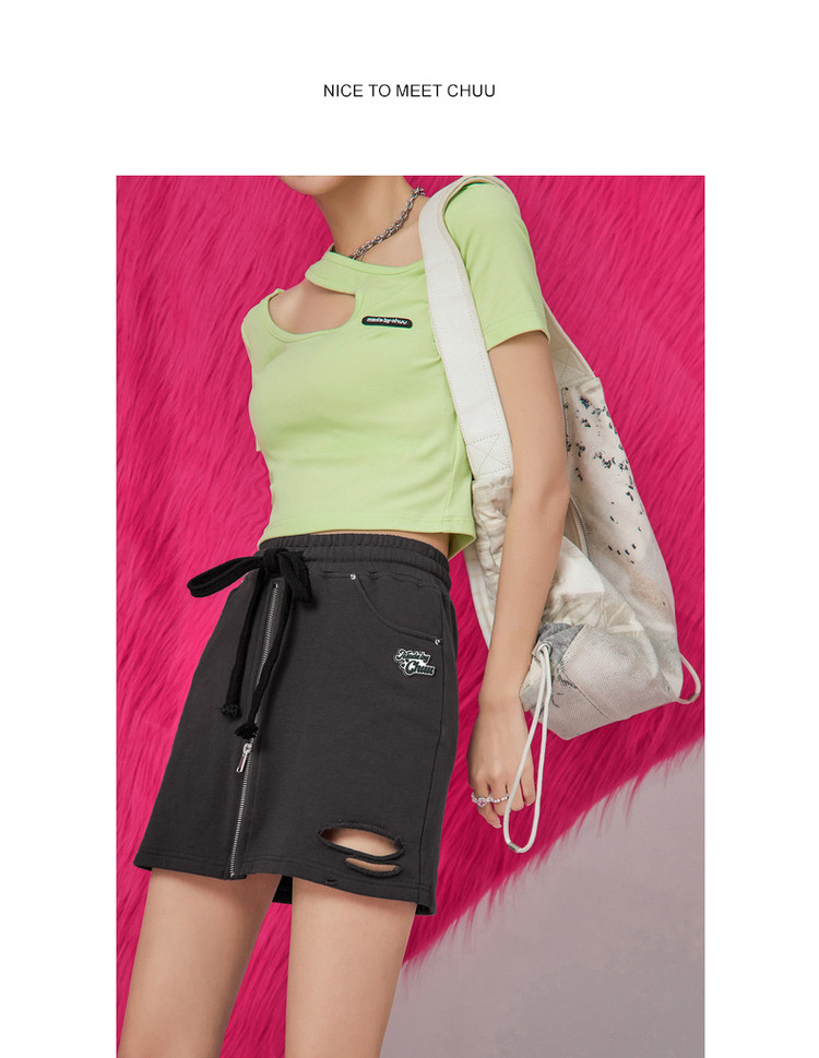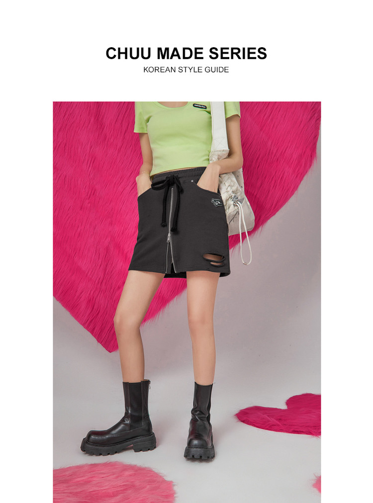 CHUU高腰抽绳破洞半身裙女春夏秋韩版拉链a字短裙 277075