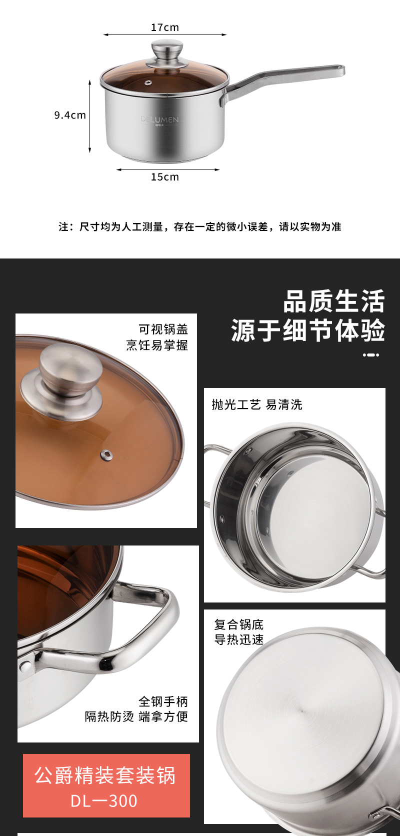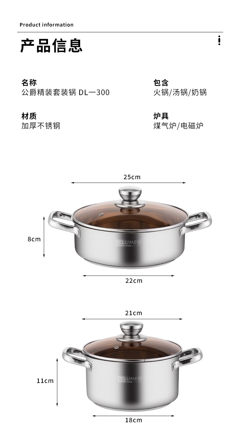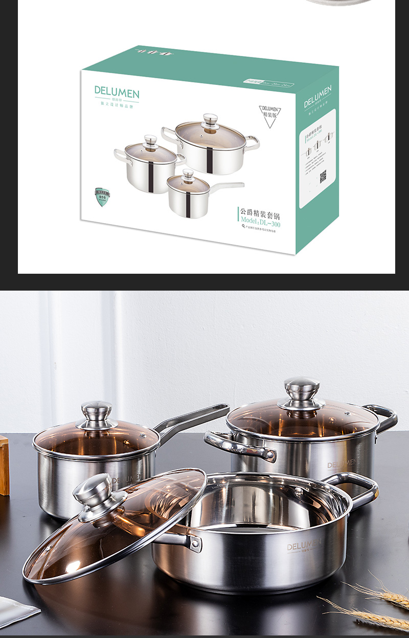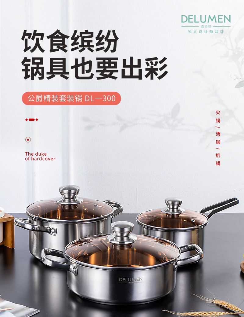 商品名称:DELUMEN/德鲁曼不锈钢公爵精装带盖锅具三件套DL-300