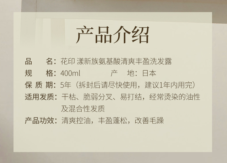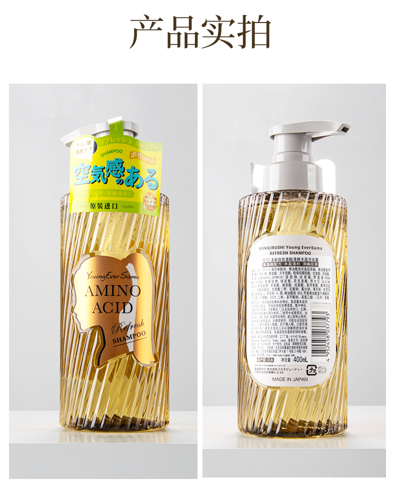 商品名称:HANAJIRUSHI/花印漾新族氨基酸清爽丰盈洗发露400ml(日版)