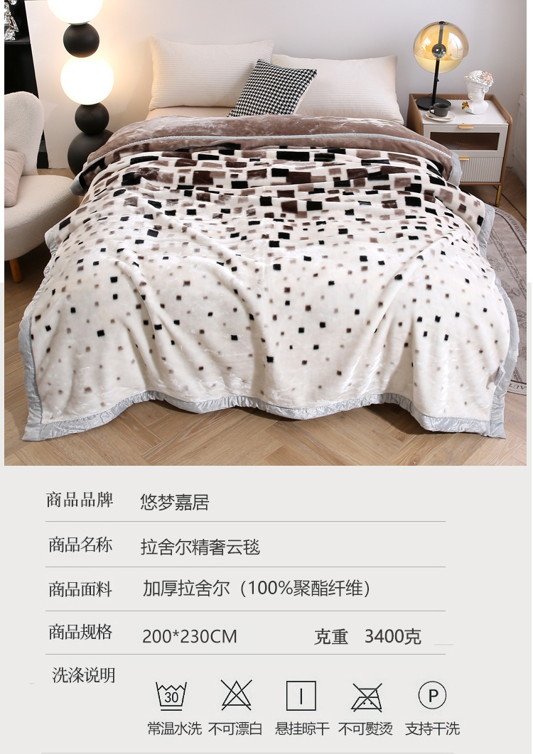商品名称:悠梦嘉居拉舍尔精奢云毯200*230cm 3400g