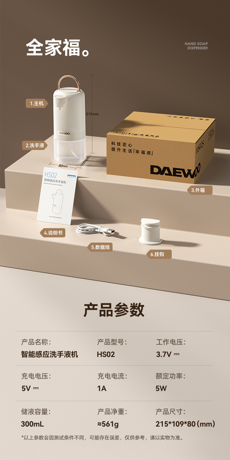 商品名称:DAEWOO/大宇300毫升智能感应洗手液机标准款HS02