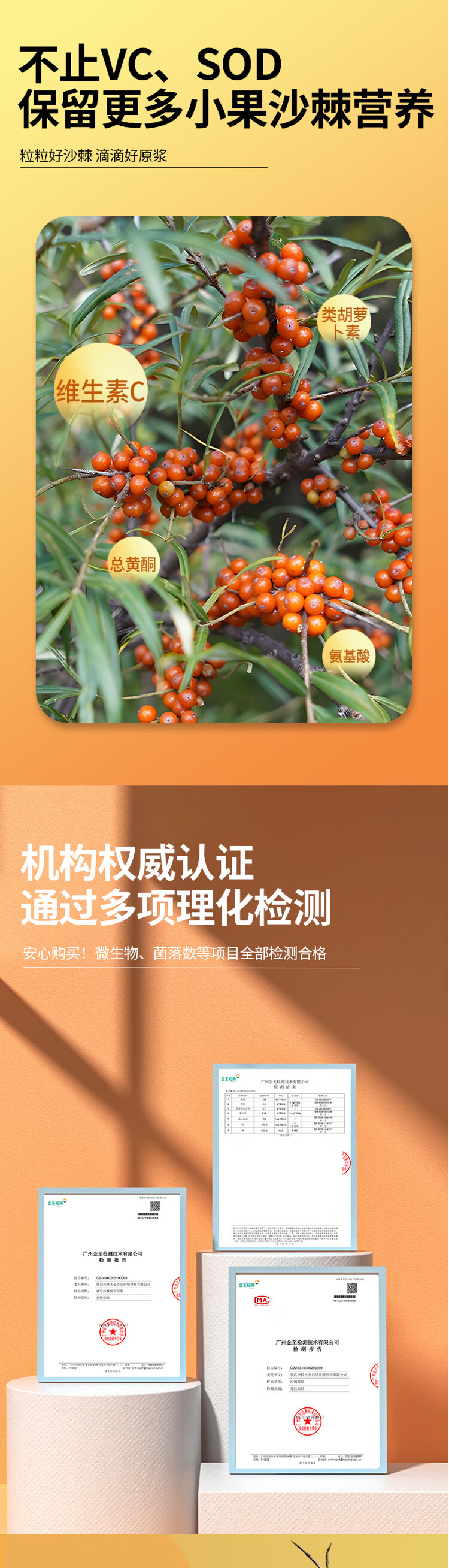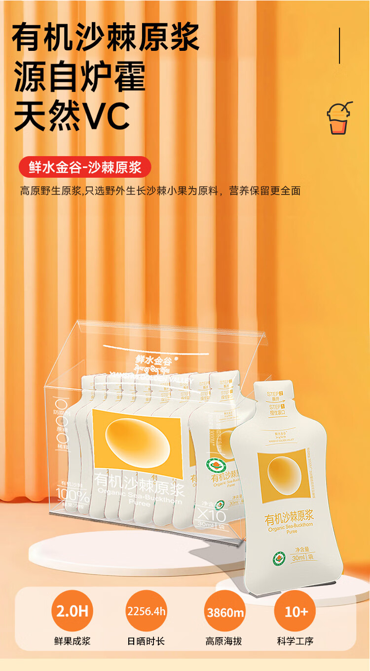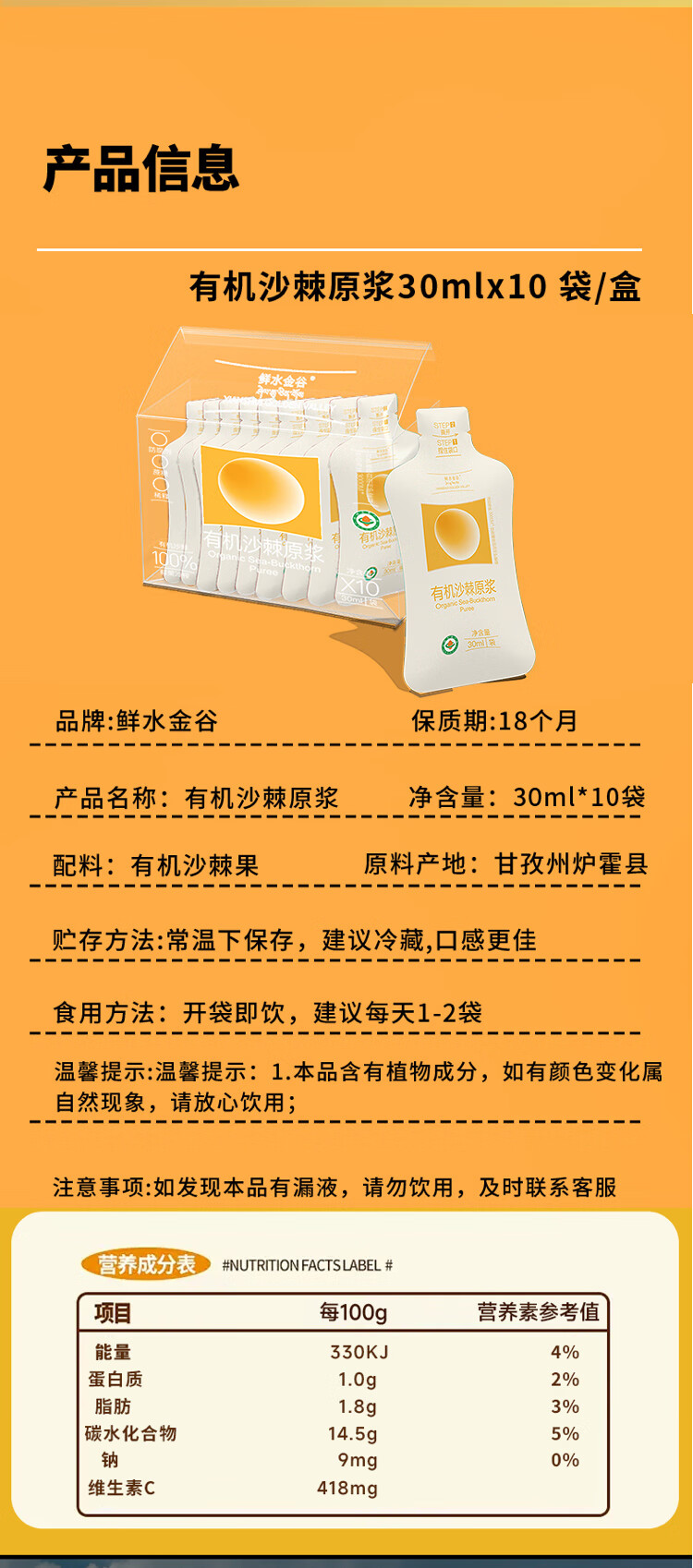 商品名称:xianjee/鲜记鲜水金谷有机沙棘原浆30m1*10袋