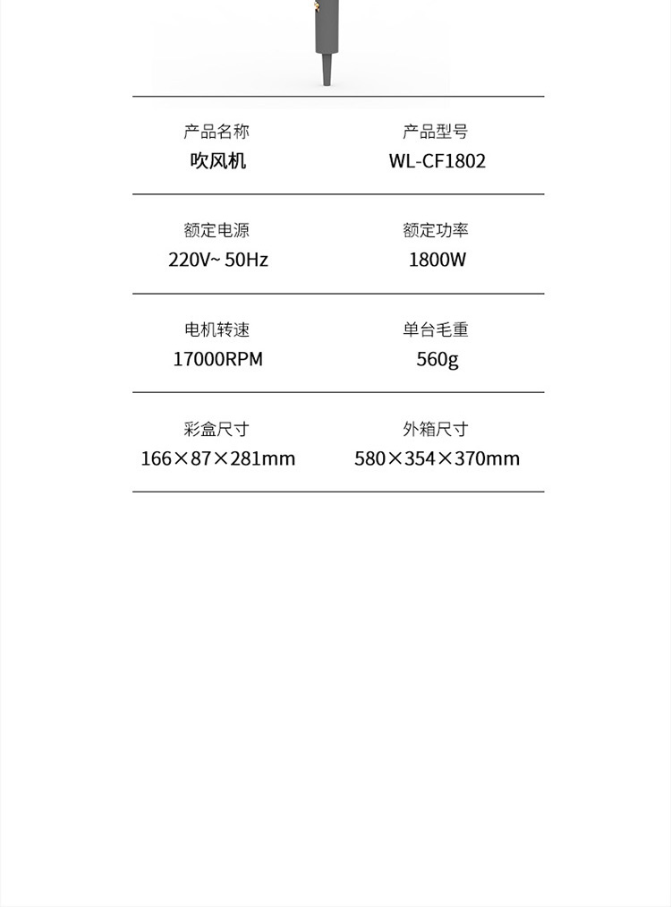 商品名称:Westinghouse/西屋吹风机WL-CF1802