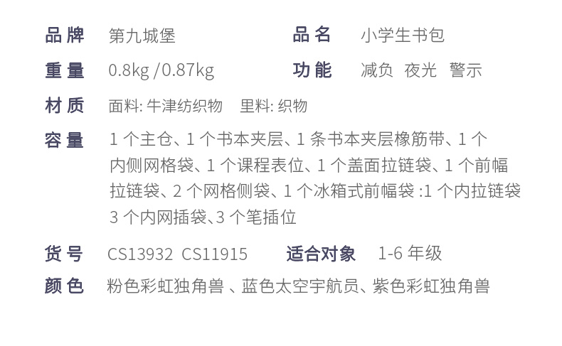 商品名称:Vnine City/香港第九城堡小学生儿童书包CS13932