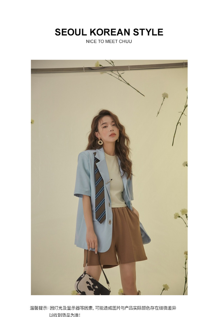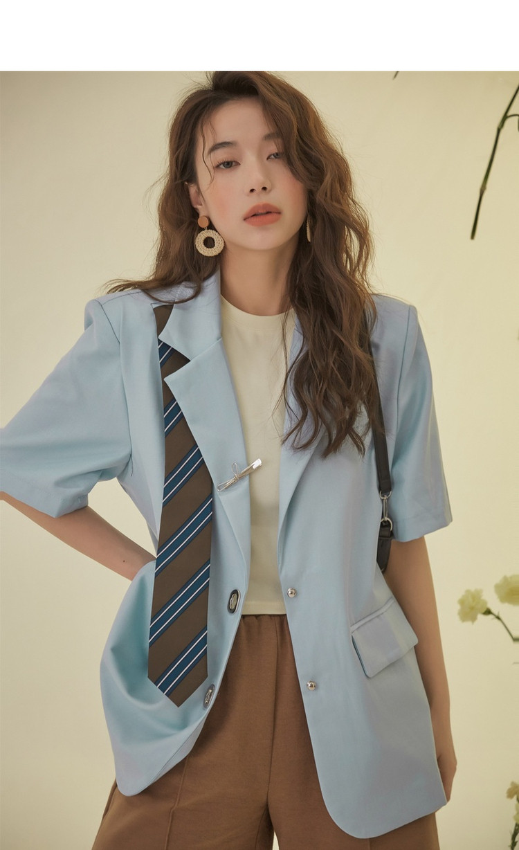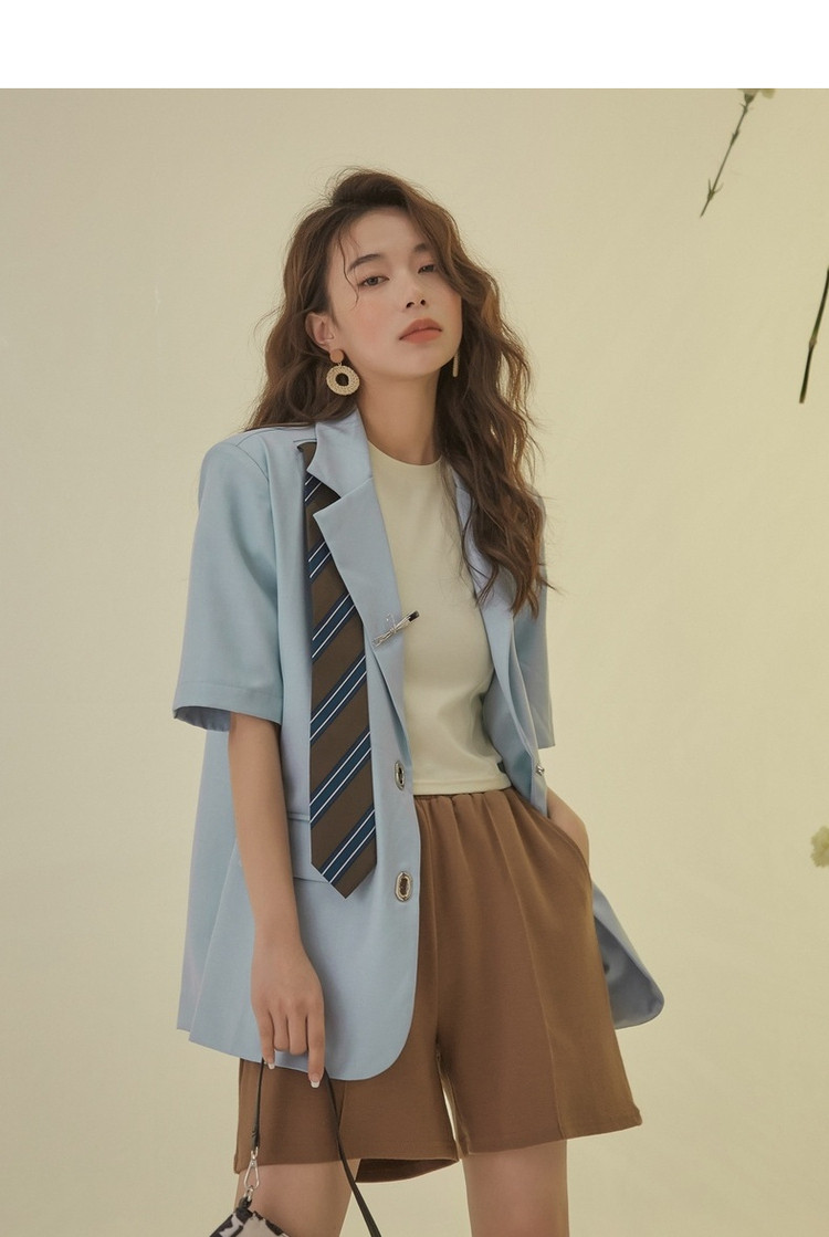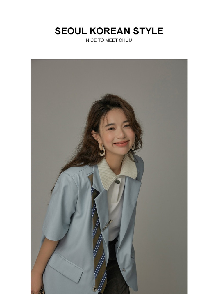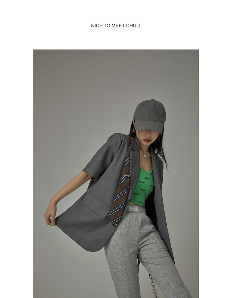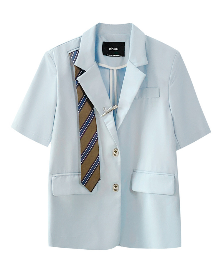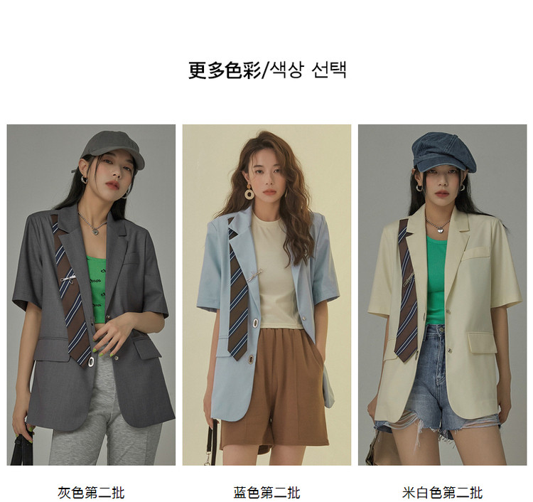 商品名称:拼色领带短袖西装女春夏设计感小众口袋百搭短袖外套 879379