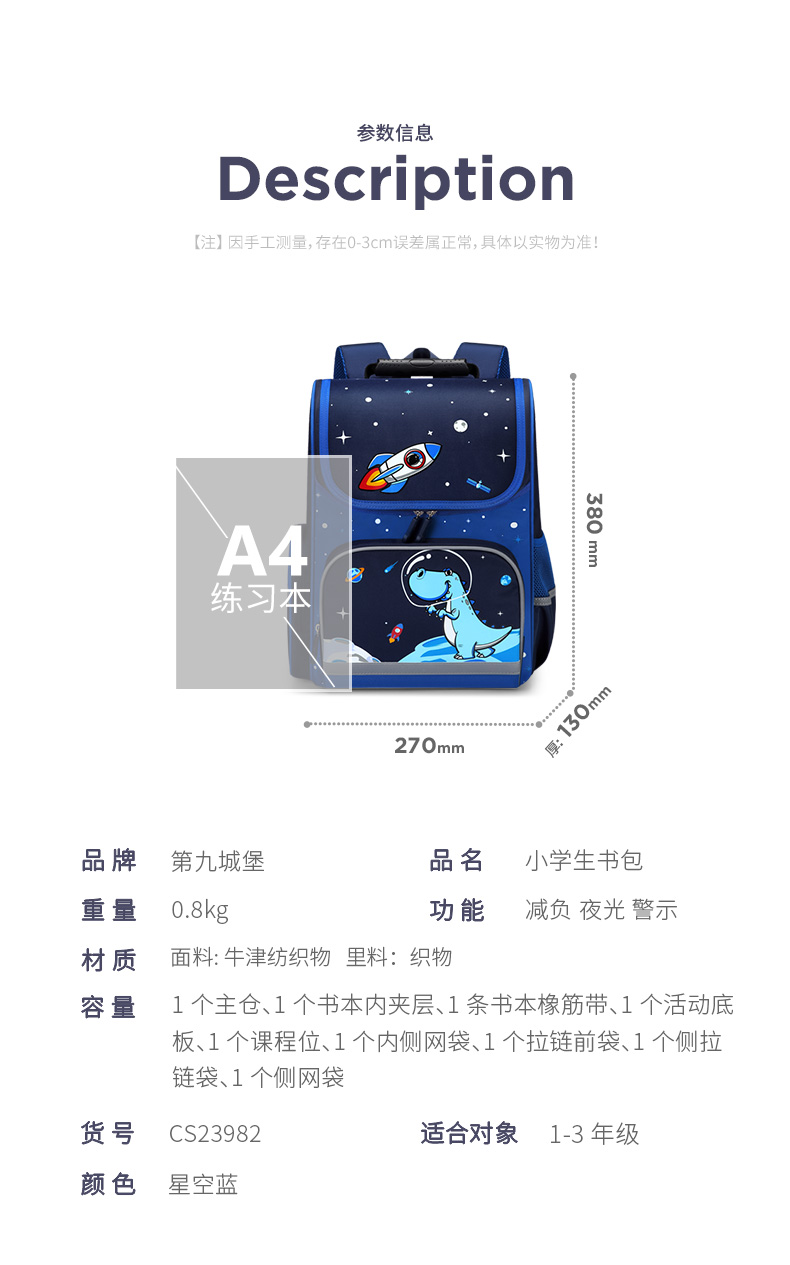 商品名称:Vnine City/香港第九城堡小学生护脊儿童书包CS23982