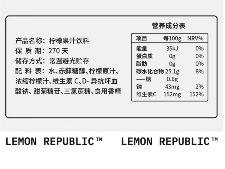 商品名称:Lemon Republic/柠檬共和国冷榨柠檬液冲饮231g*3盒