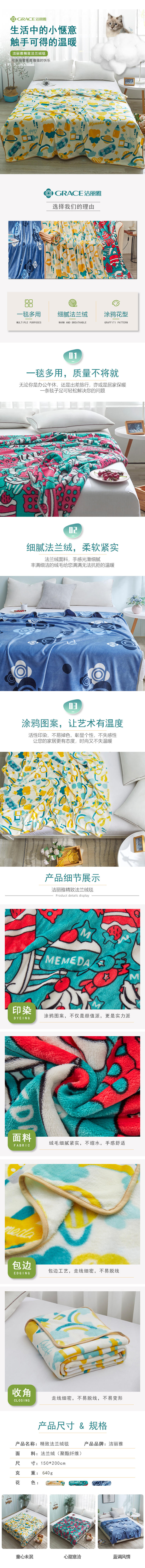 商品名称:GRACE/洁丽雅精致法兰绒毯150*200cm 640g