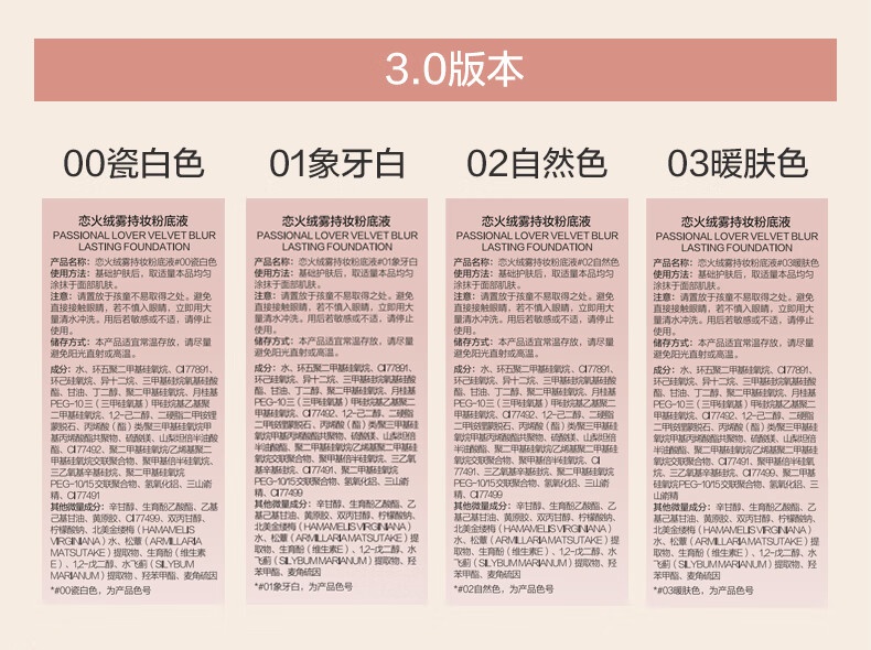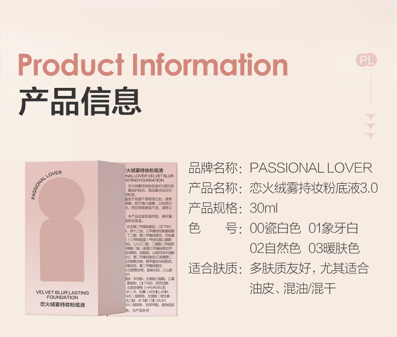 商品名称:PASSLONAL LOVER/恋火3.0版本绒雾持妆粉底液30ml