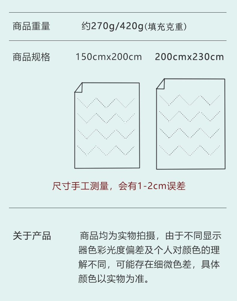 产品尺寸克重:150*200cm 1.05kg 200*230cm 1.6kg
