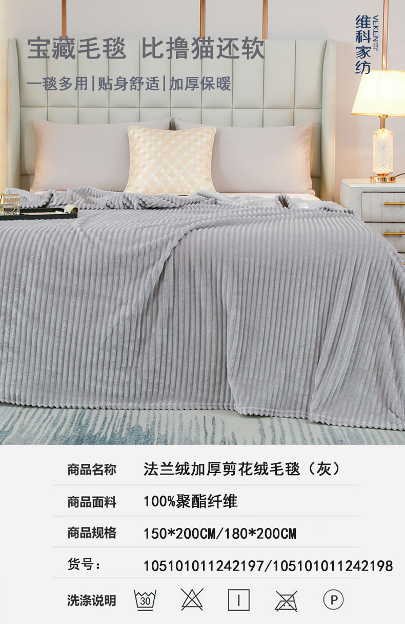 商品名称:VEKEN/维科家纺加厚剪花绒法兰绒毯-灰色