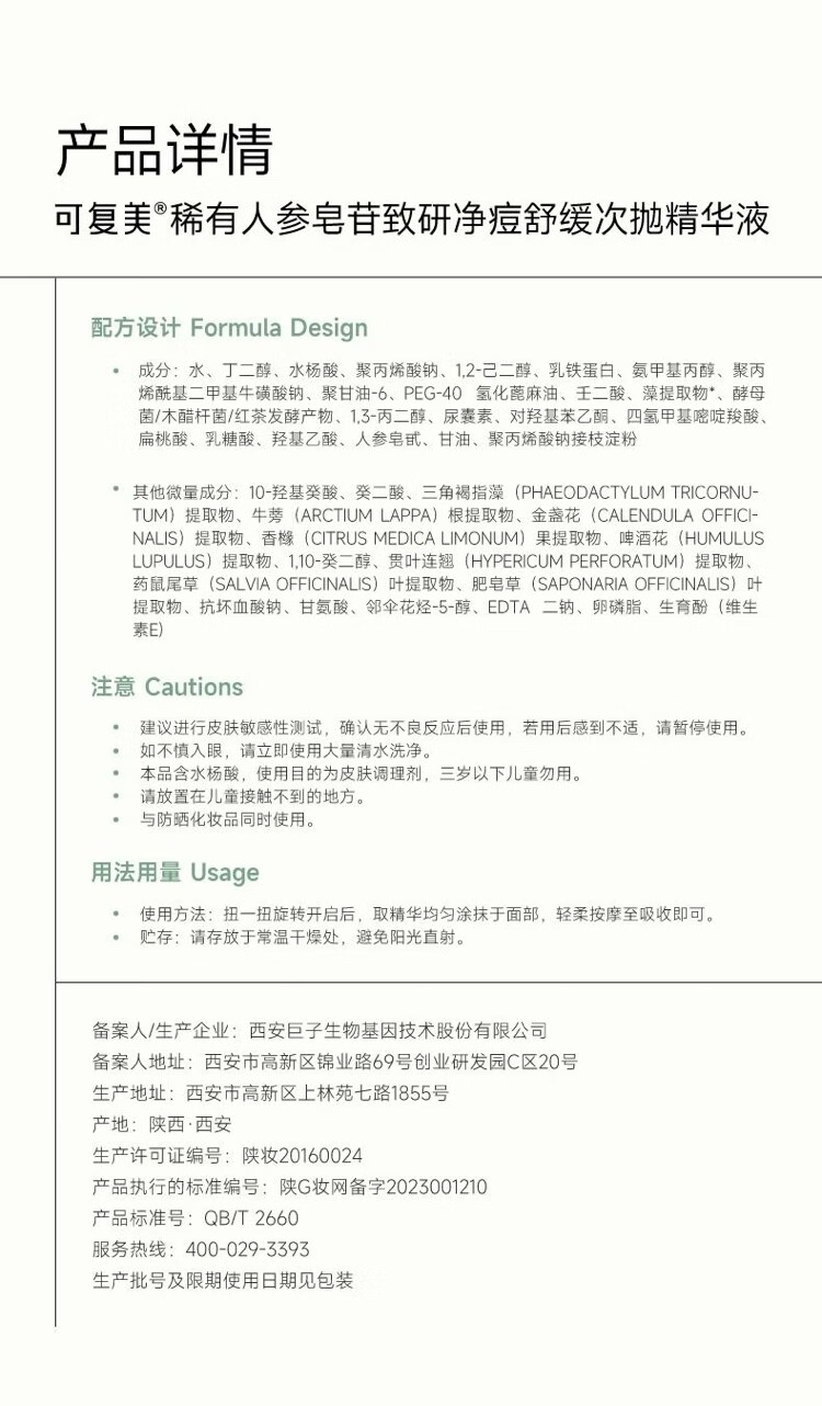 可复美稀有人参皂苷致研净痘舒缓秩序次抛精华液1.5ml*30支