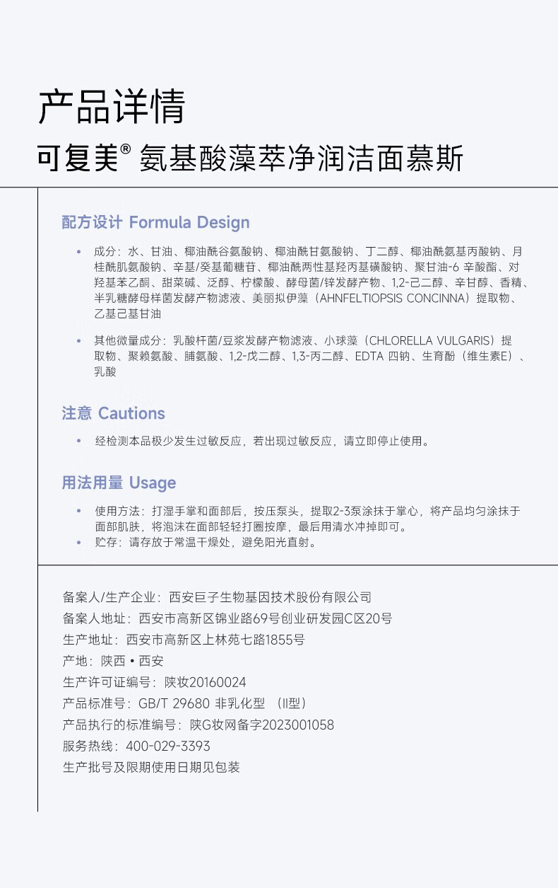 商品名称:可复美氨基酸藻萃净润洁面慕斯150ml