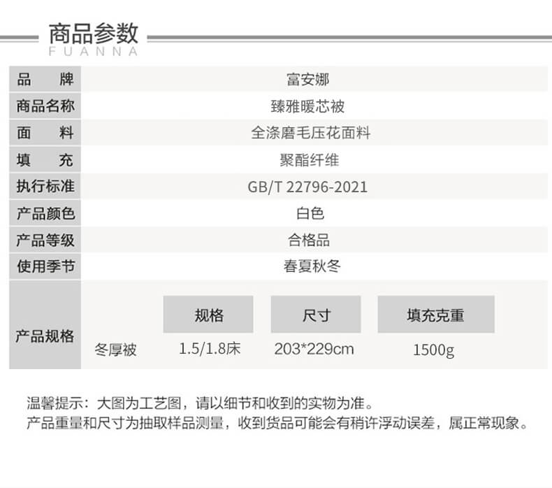 商品名称:FUANNA/富安娜臻雅暖芯被 203*229cm 1500g