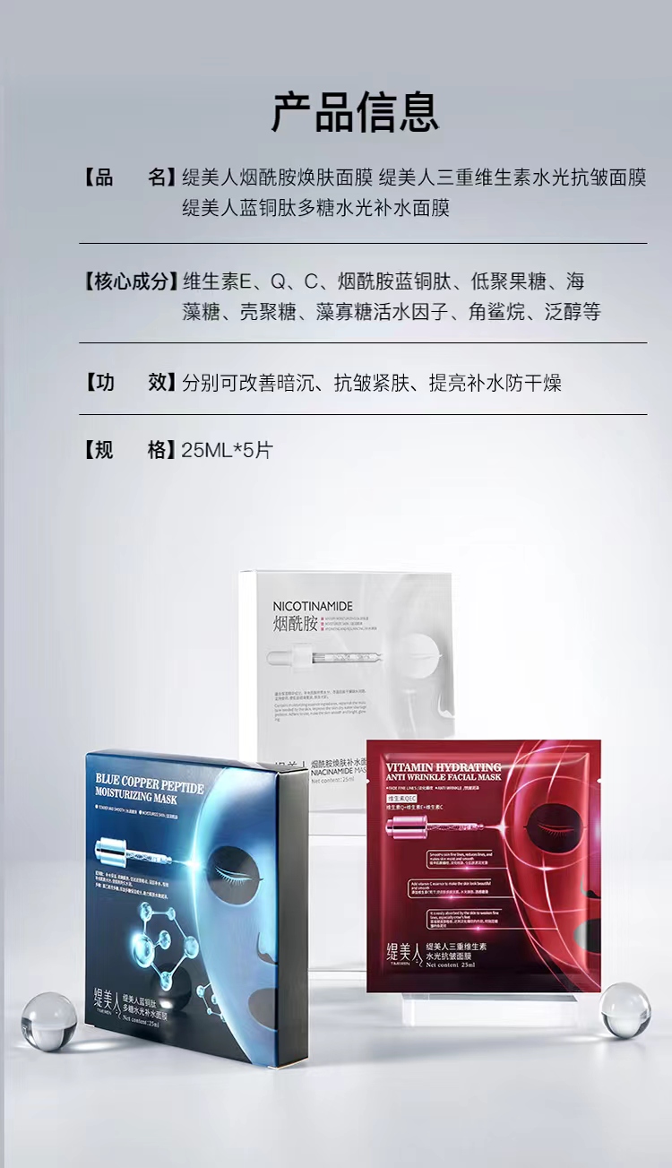 三重维生素水光抗皱面膜25ml×5 蓝铜肽多糖水光补水面膜25ml×5 烟酰胺焕肤补水面膜25ml×5