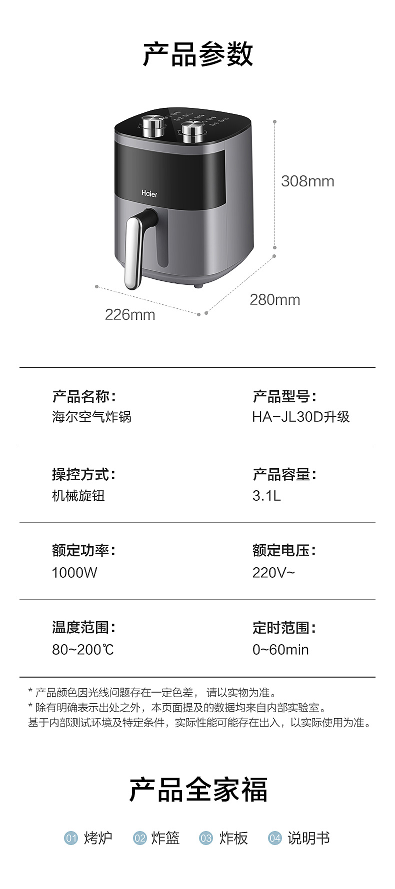商品名称:Haier/海尔3.1升可视空气炸锅HA-JL30D升级