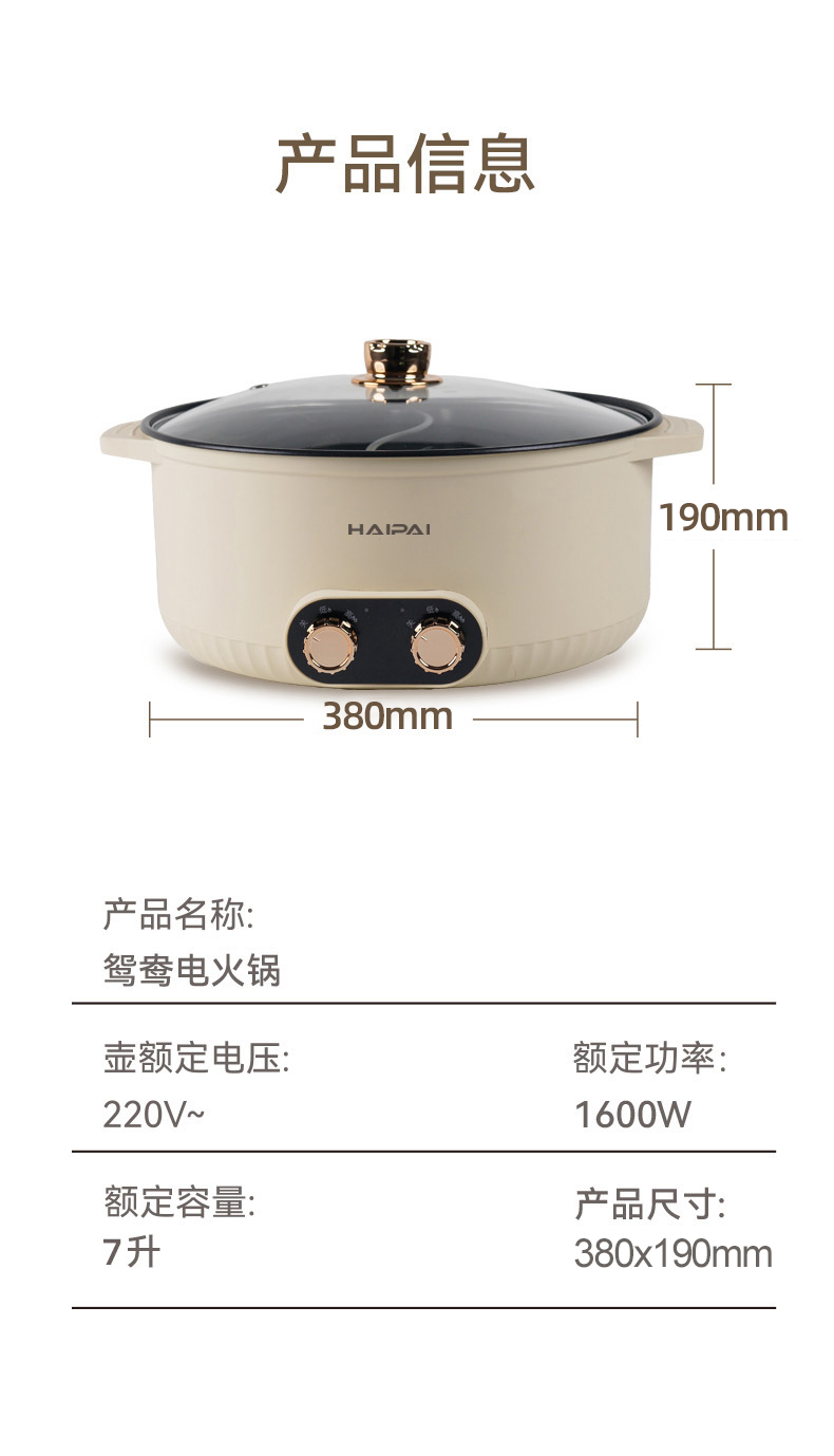 商品名称:HAIPAI/海牌7升鸳鸯火锅HP-Y07B