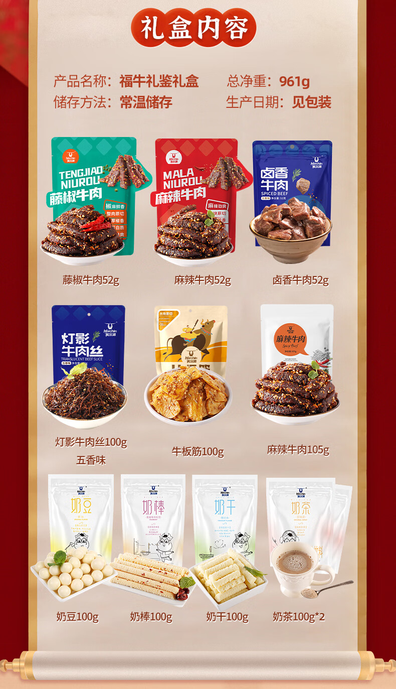 商品名称:Kerchin/科尔沁福牛礼鉴草原零食礼盒961g