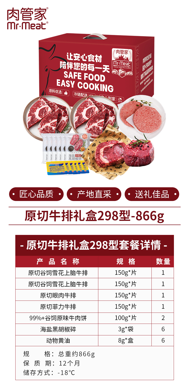 商品名称:【顺丰配送】肉管家298型原切牛排礼盒约866g