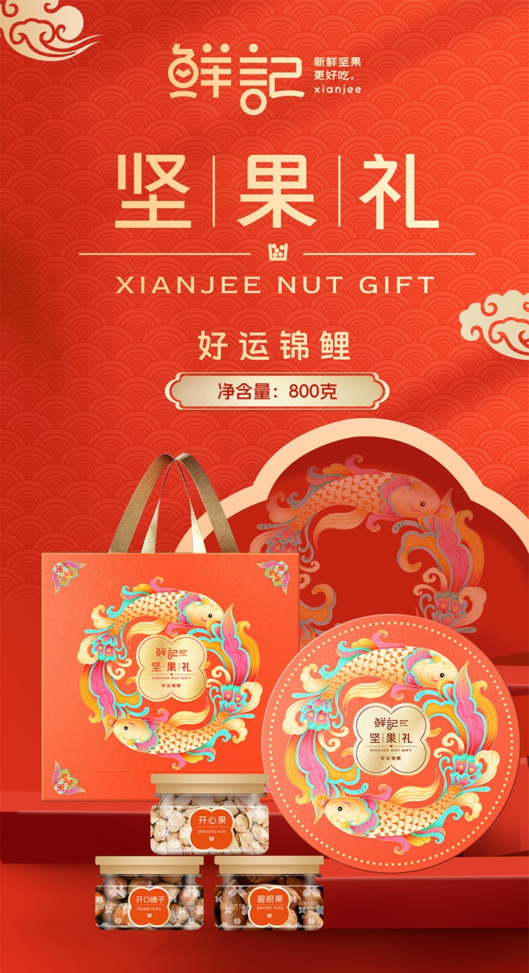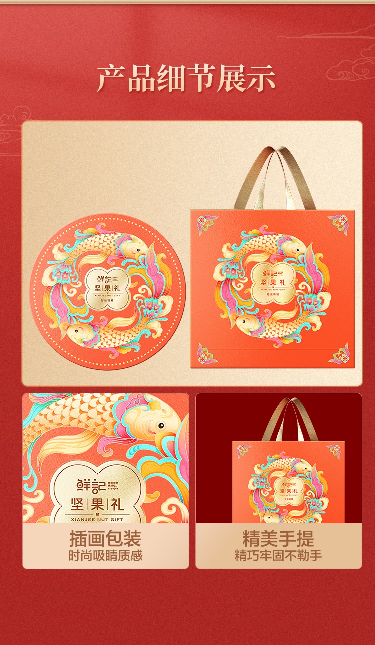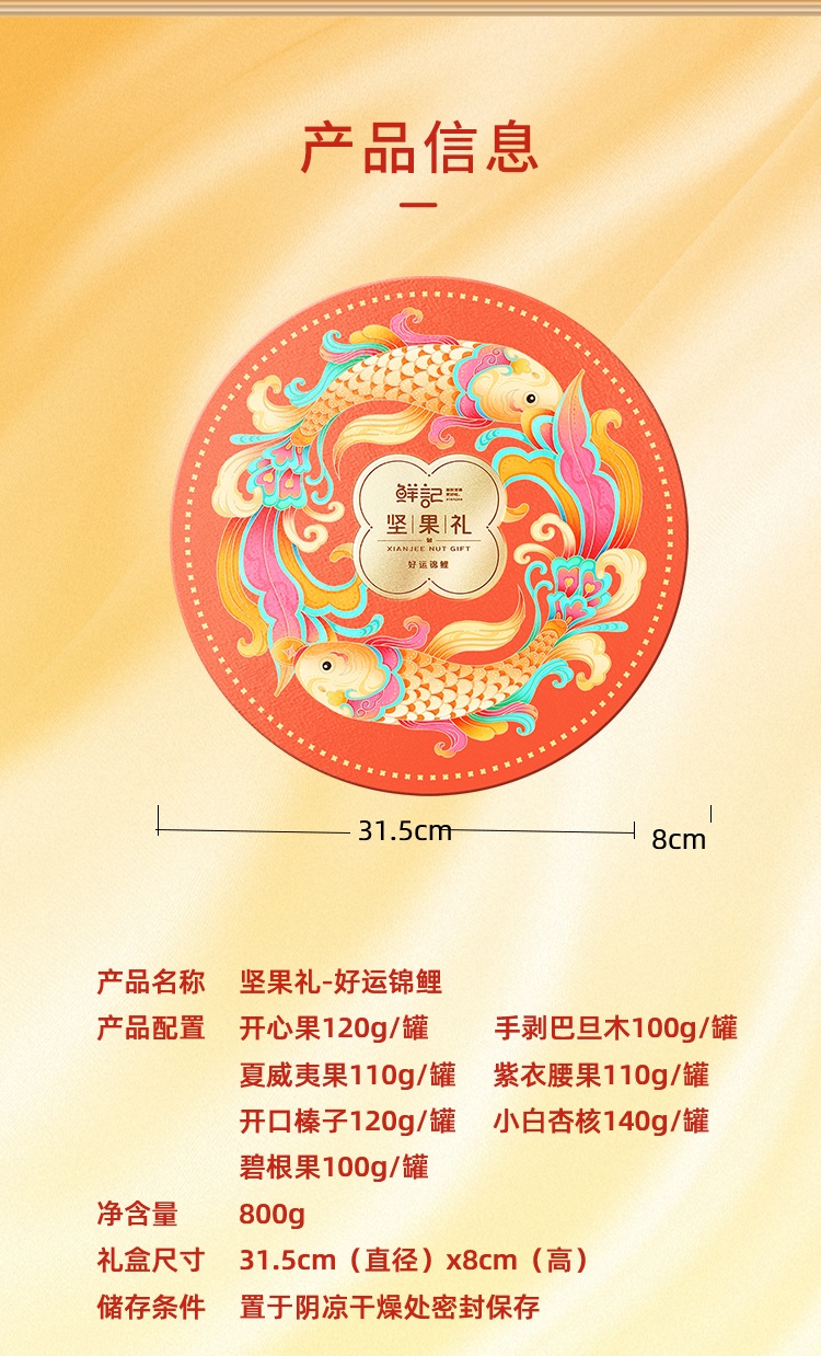 商品名称:【京东/顺丰/德邦配送】xianjee/鲜记坚果礼好运锦鲤坚果礼盒800g