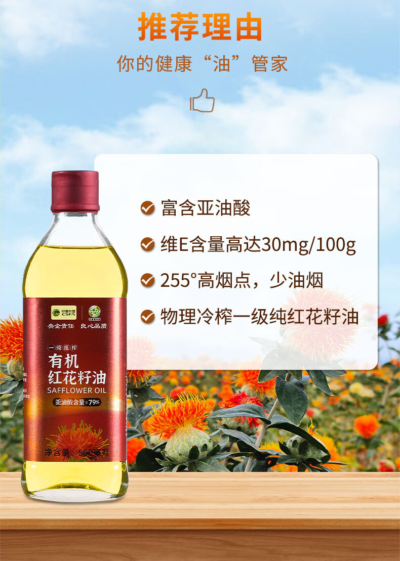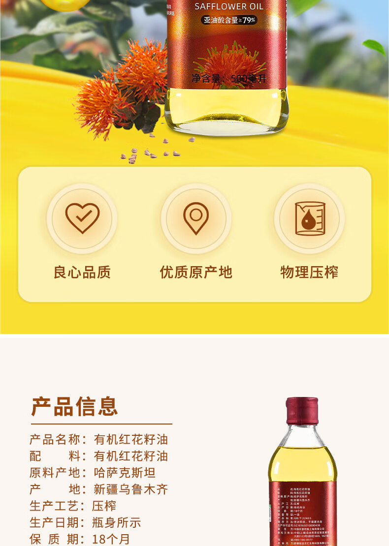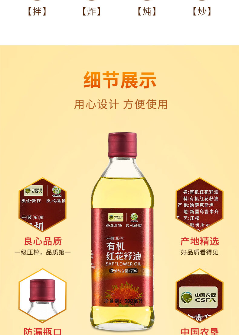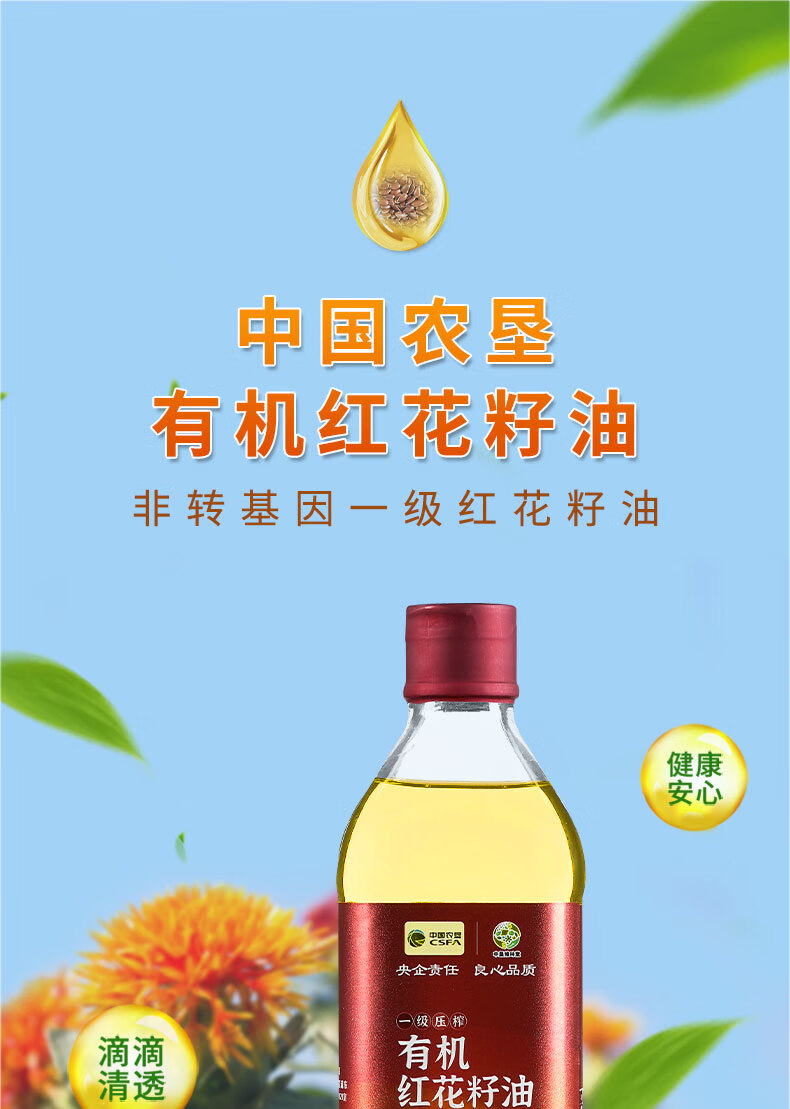 商品名称:'西北专供'【德邦配送】CSFA/中国农垦中垦飨味堂一 级压榨有机红花籽油500ml