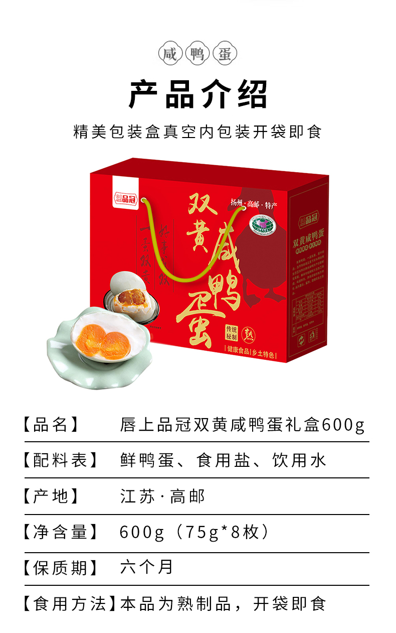 商品名称:唇上品冠双黄咸鸭蛋礼盒约600g