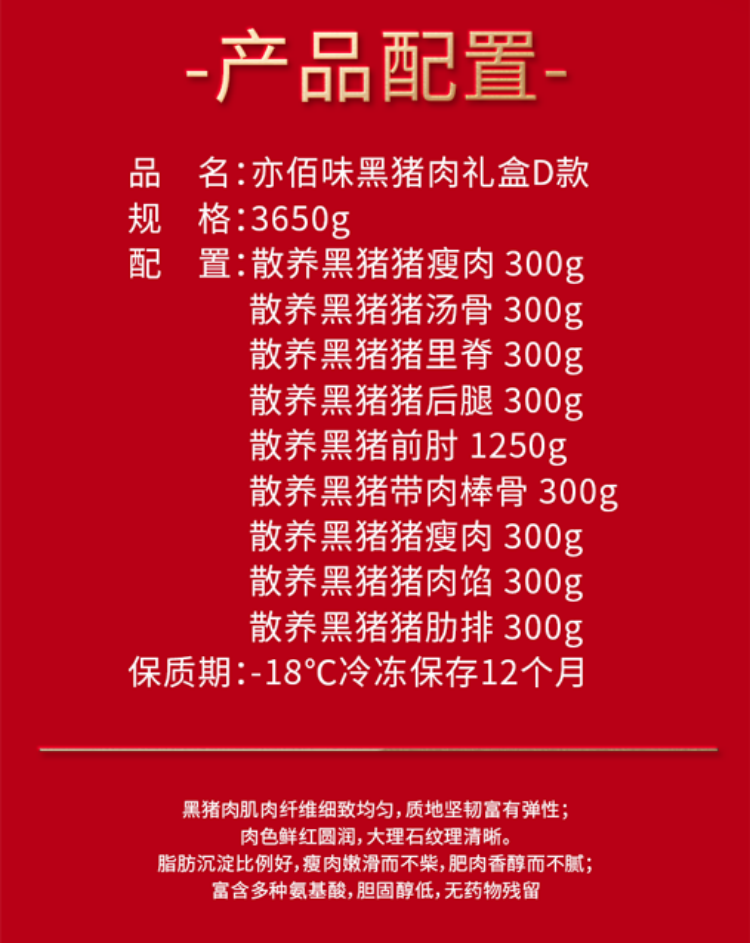 商品名称:【京东/顺丰配送】亦佰味林间黑猪肉生鲜礼盒D款3650g