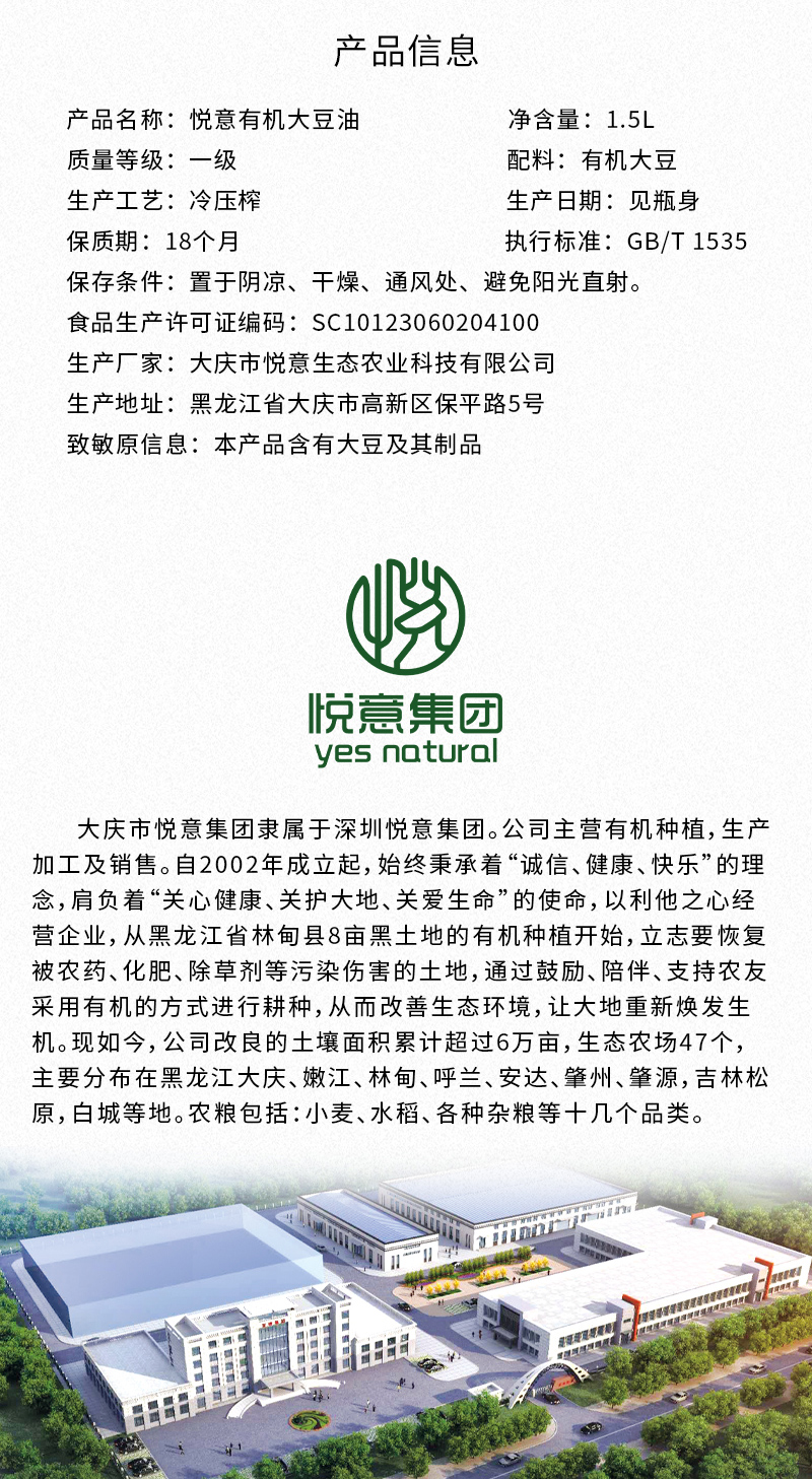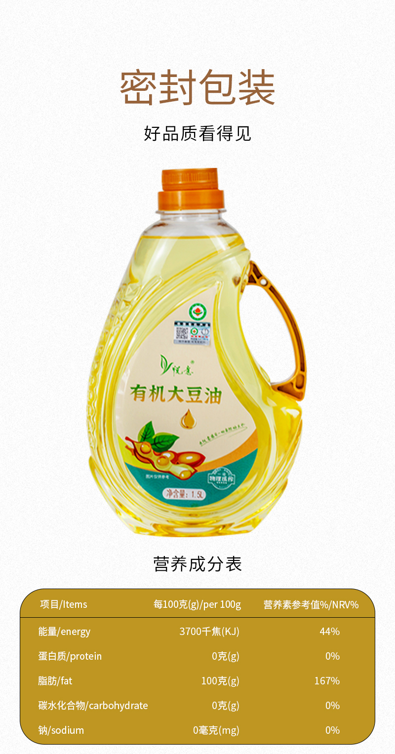 商品名称:悦意有机大豆油1.5L*2瓶(大庆仓)