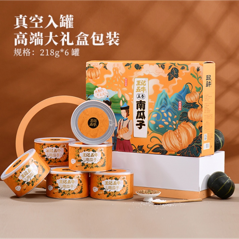 商品名称:王记五牛五香水煮南瓜子6罐装礼盒1308g