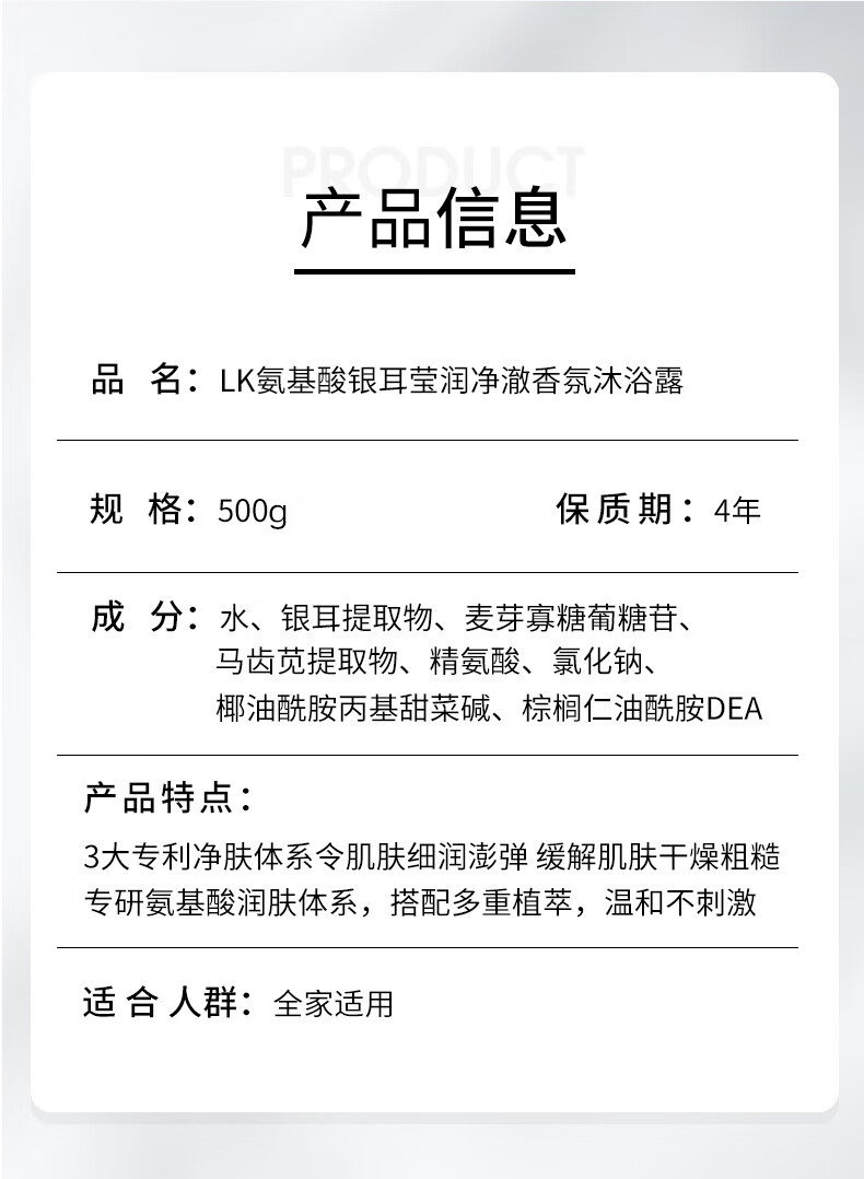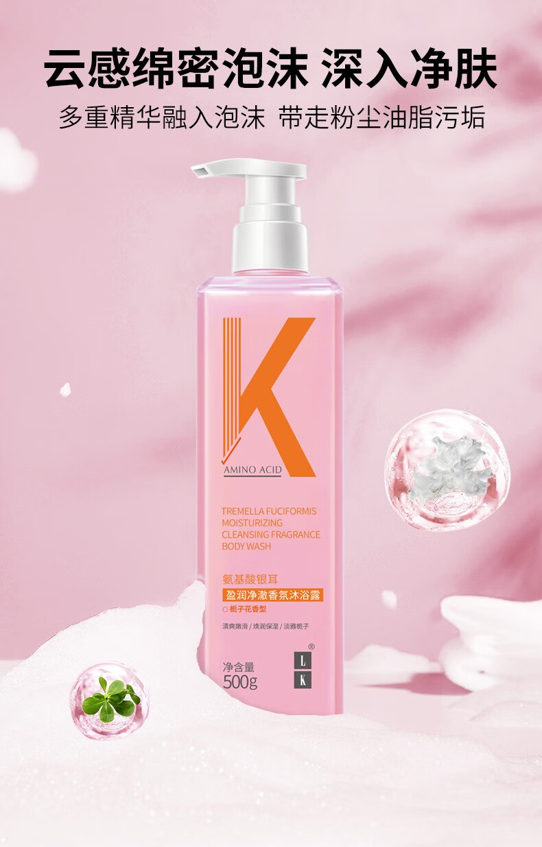 商品名称:LK栀子花香型氨基酸银耳莹润净澈香氛沐浴露500g*2瓶