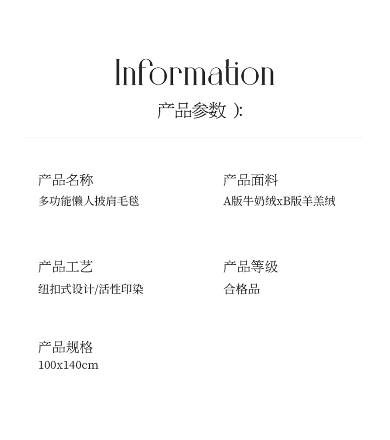 商品名称:舒正多功能懒人披肩毛毯100*145cm 500g