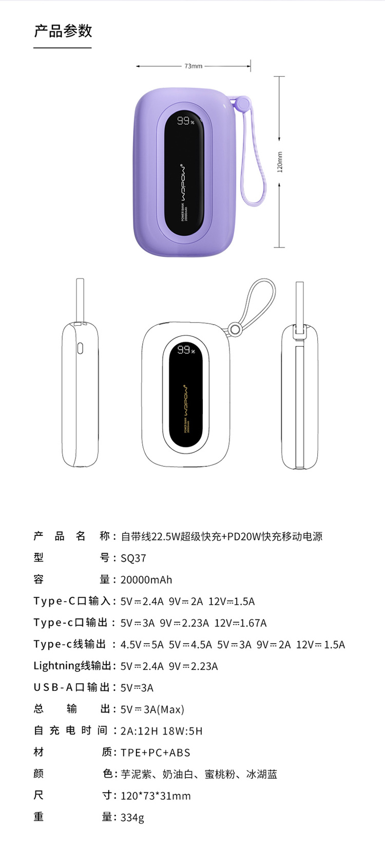 商品名称:WOPOW/沃品20000毫安自带线小彩蛋快充移动电源SQ37