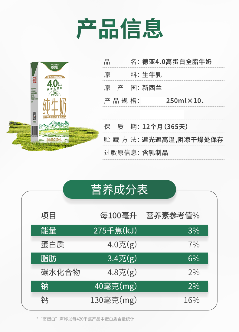 商品名称:Weidendorf/德亚4.0高蛋白全脂牛奶整箱250ml*10盒