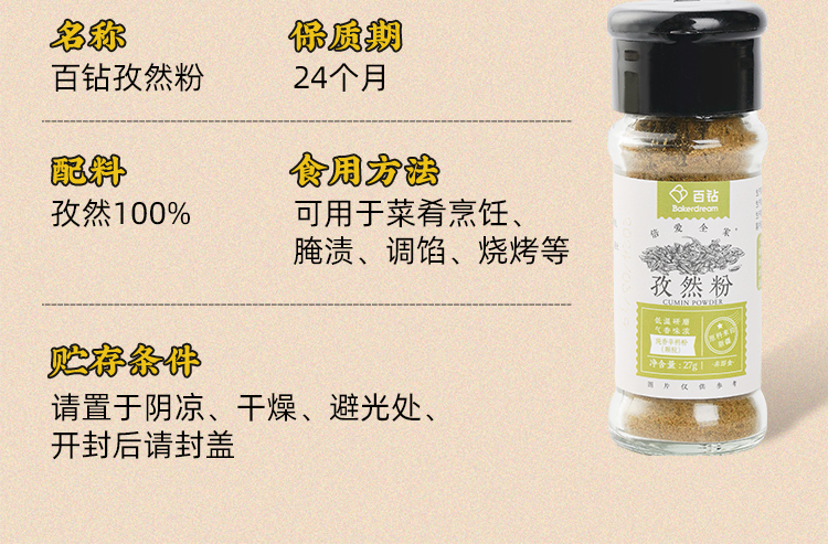 商品名称:Bakerdream/百钻孜然粉27g*2瓶
