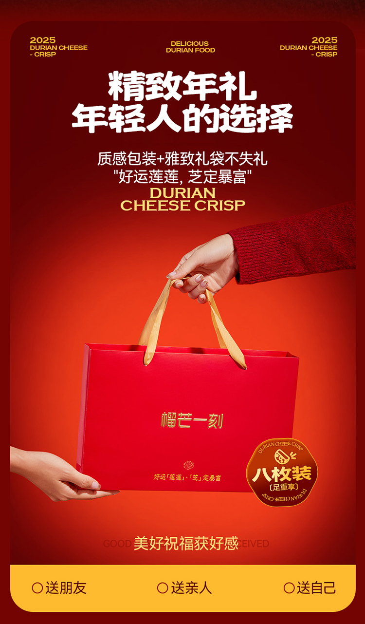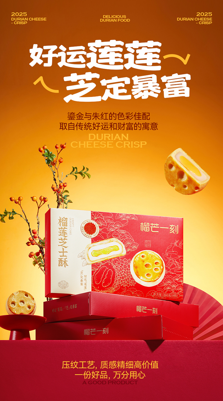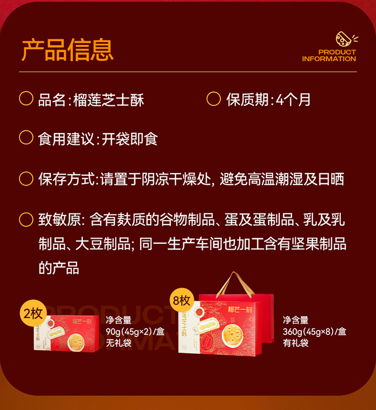 商品名称:榴芒一刻榴莲芝士酥组合45g*8枚*1盒(配礼袋)+45g*2枚*1盒(无礼袋)