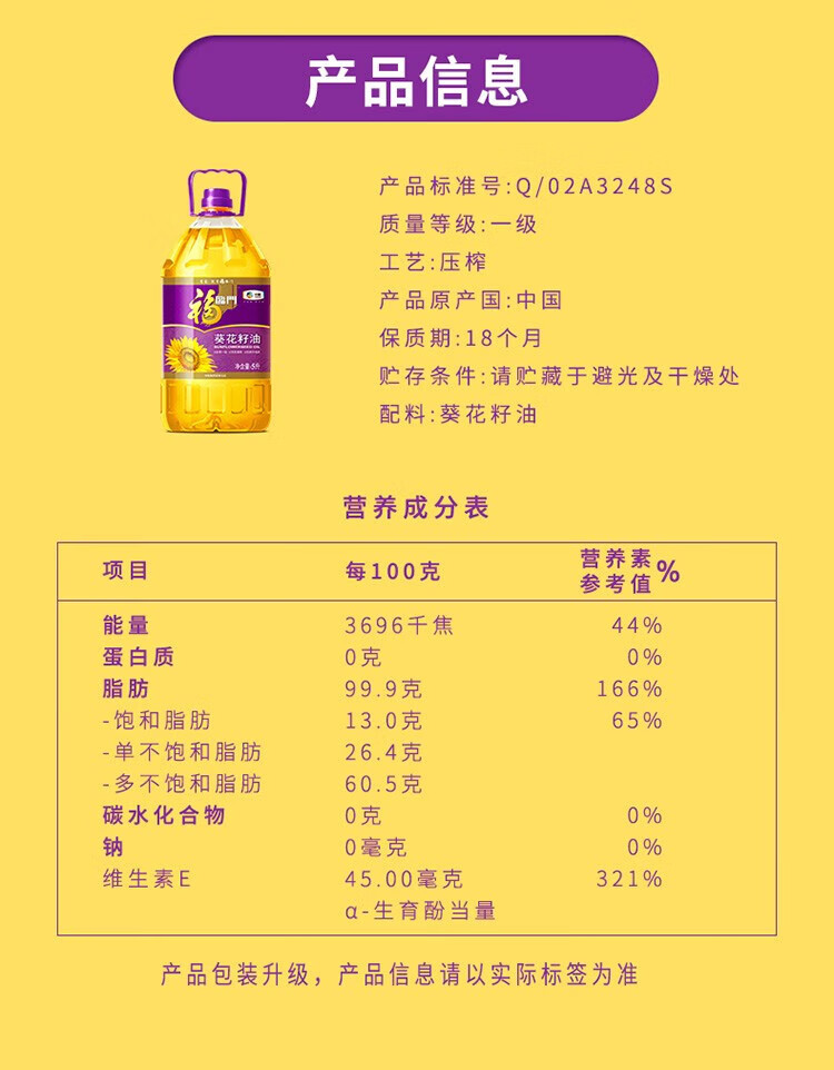 商品名称:中粮福临门压榨一级葵花籽油5L