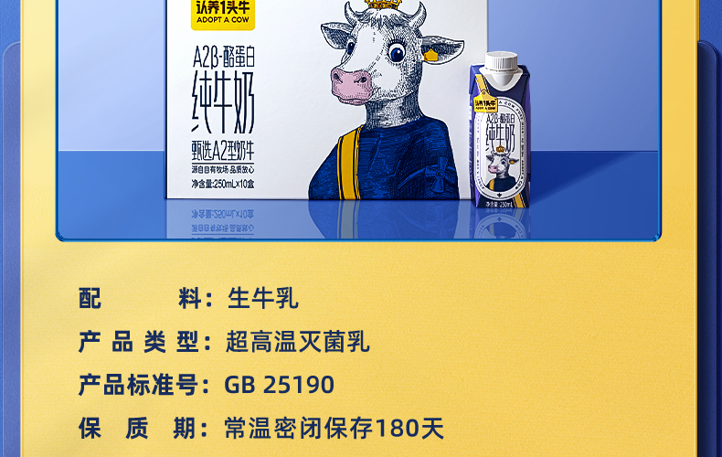 商品名称:认养一头牛A2β酪蛋白纯牛奶250ml*10盒