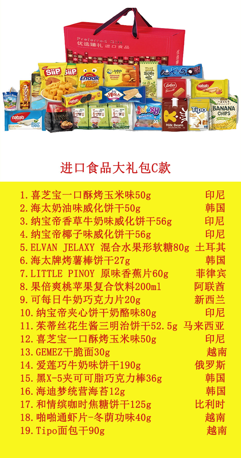 商品名称:优选臻礼进口零食礼盒C款1104.5g+200ml