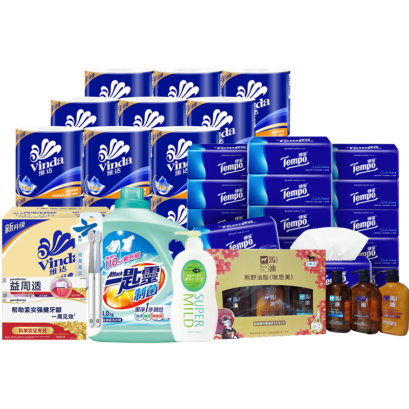 1.咖思美马油套装洗护沐3件套洗发水600ml+护发素600ml+沐浴露600ml 1套 2.惠润沐浴露(淡雅柑橘香)650ml 1瓶 3.花王(KAO)进口一匙灵抑菌除垢超浓缩洗衣液 3kg 1瓶 4.V4069-B 维达蓝色经典卷纸4层140克×27卷 1箱 5.得宝抽纸整箱装90抽软抽4层18包抽纸 1箱 6.益周适 精研牙龈专修紧实健龈牙膏 180g*3支 1套 7.云南白药金口健牙刷(银翼旋风2支装) 1组