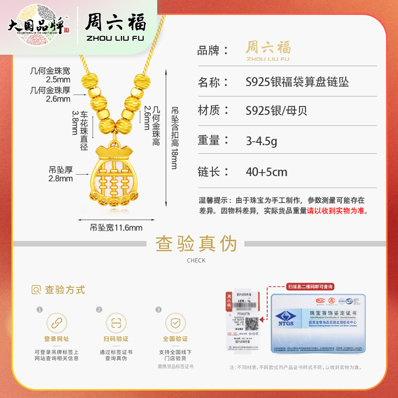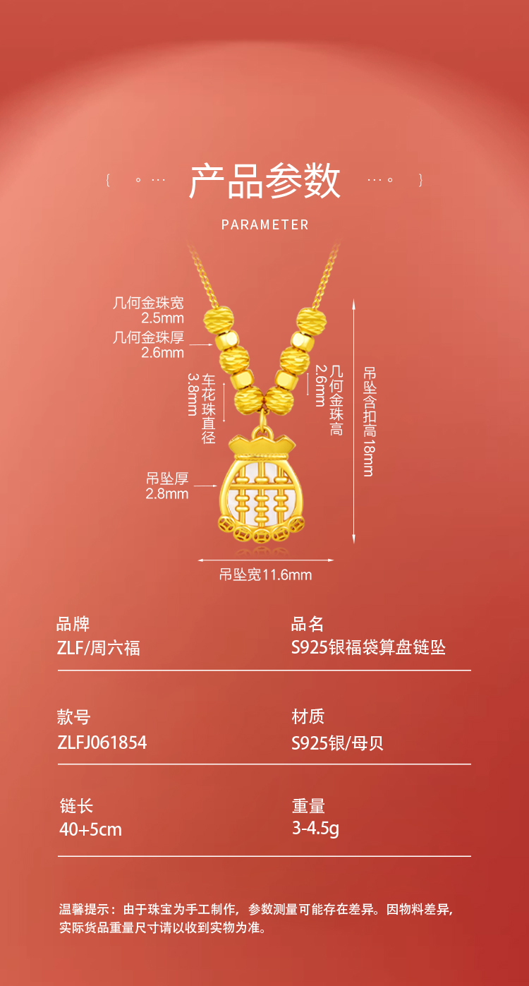 商品名称:周六福S925银福袋算盘项链ZLFJ061854