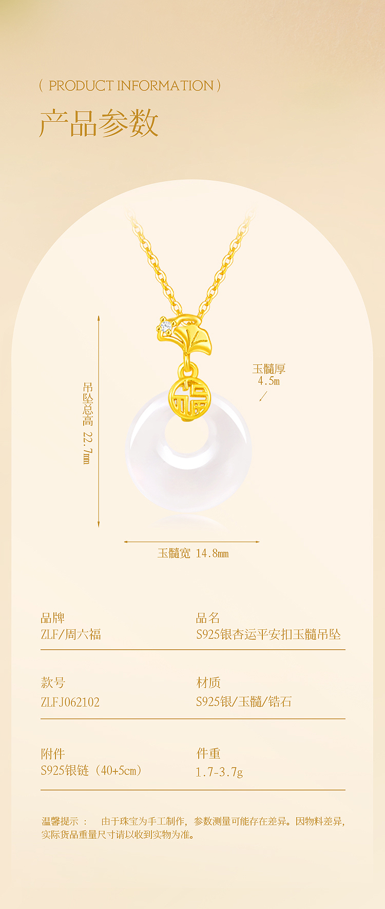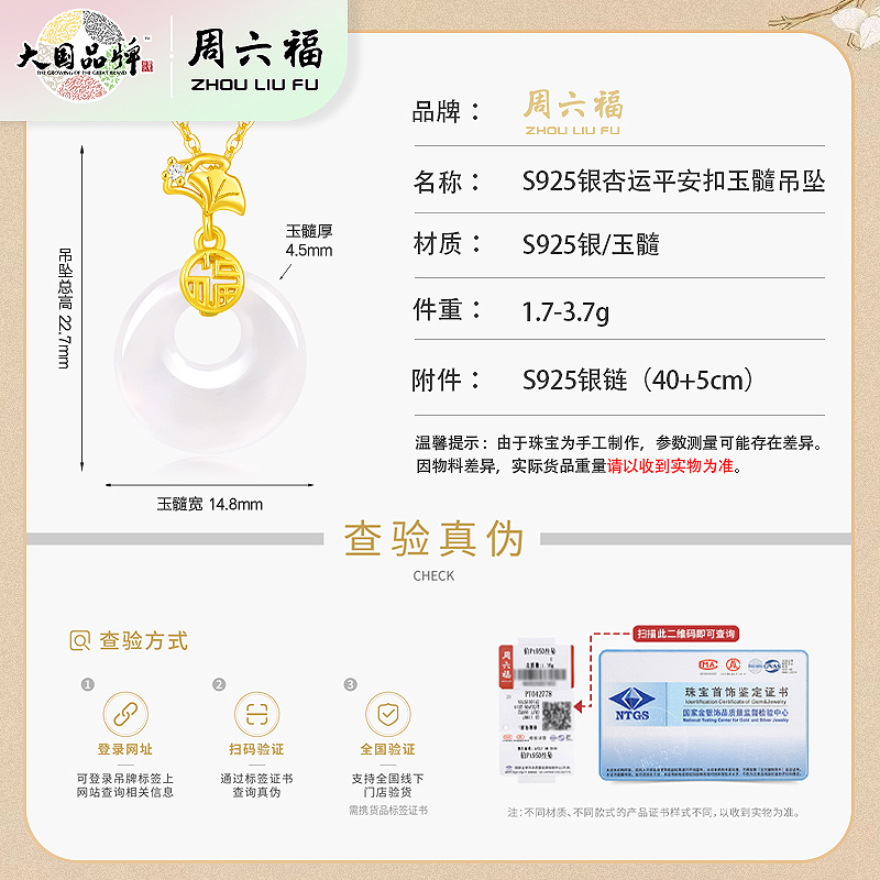 商品名称:周六福S925银杏运平安扣玉髓吊坠ZLFJ062102