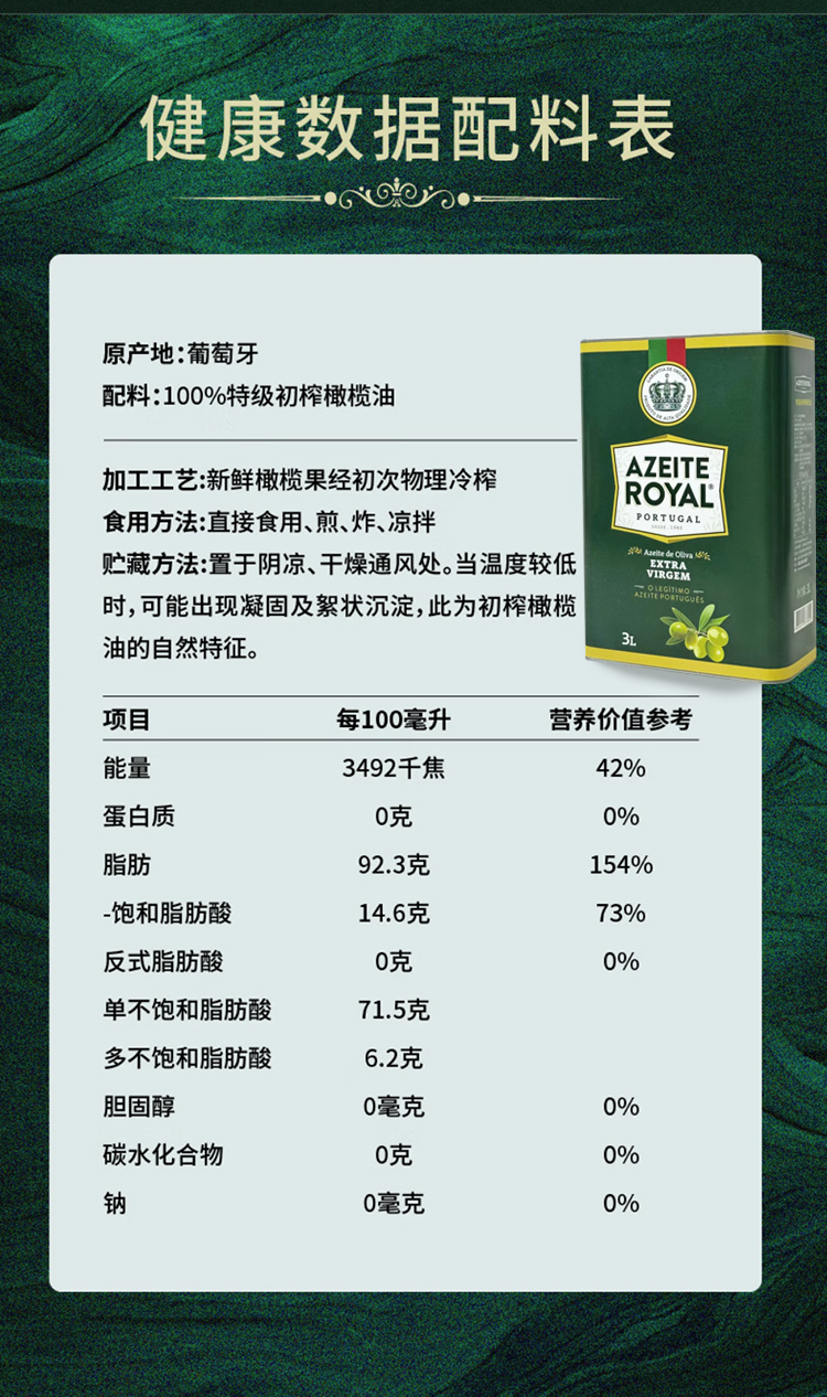 商品名称:【京东/德邦配送】AZEITE ROYAL/皇冠特级初榨橄榄油3L