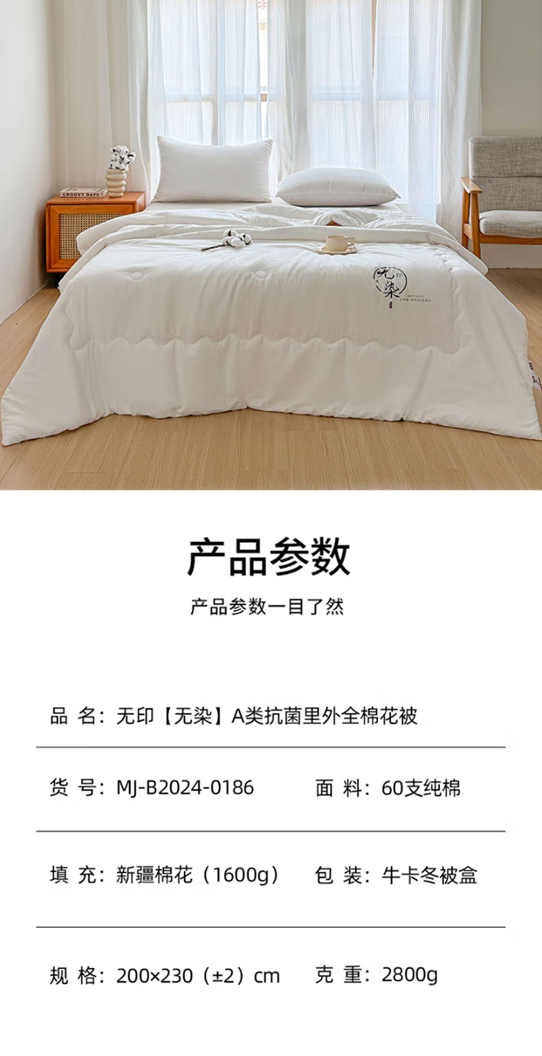 商品名称:无印良品无染A类抗菌里外全棉棉花冬被200*230cm 2800g