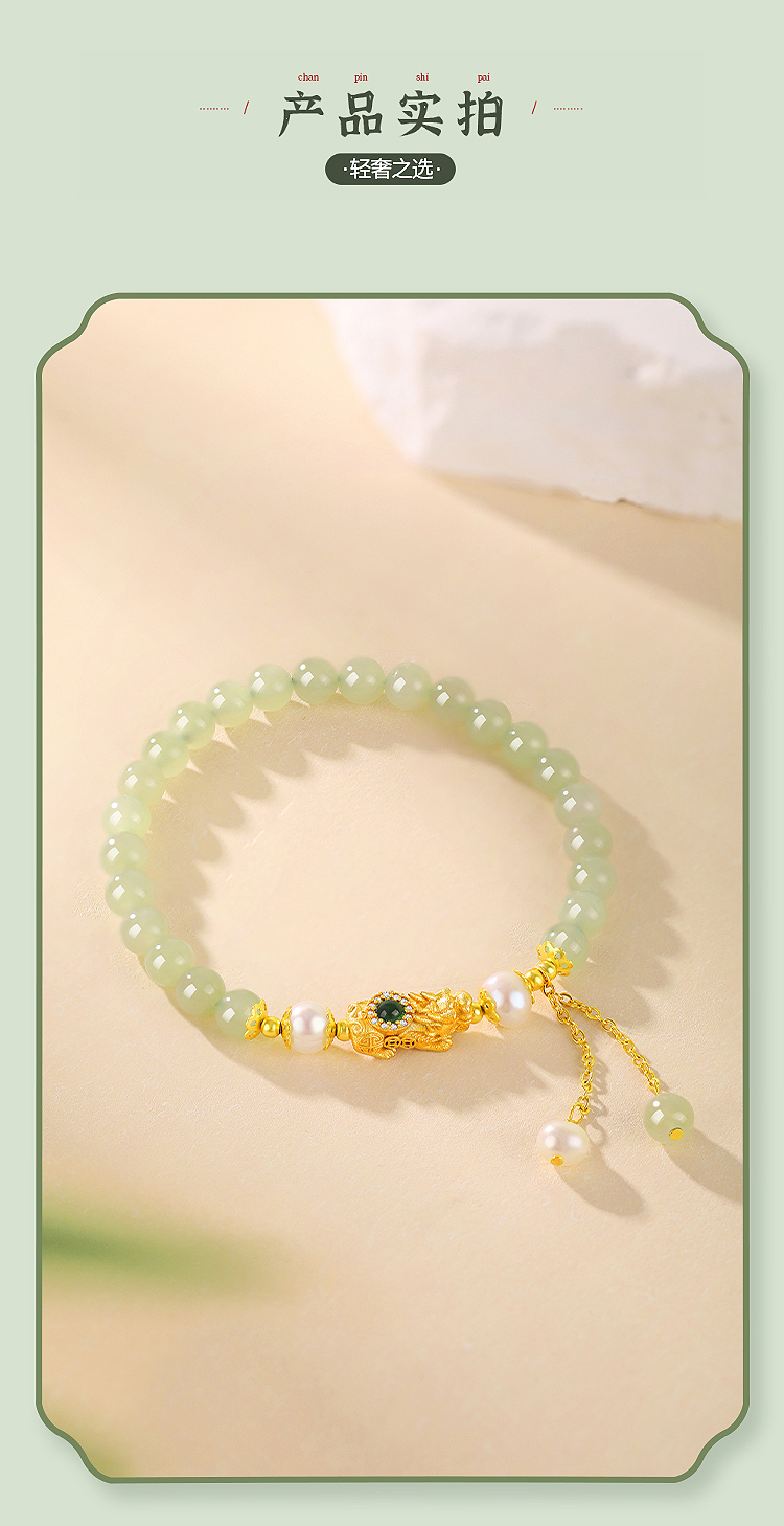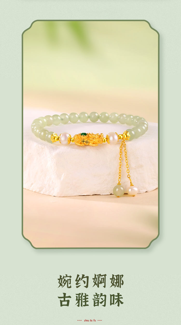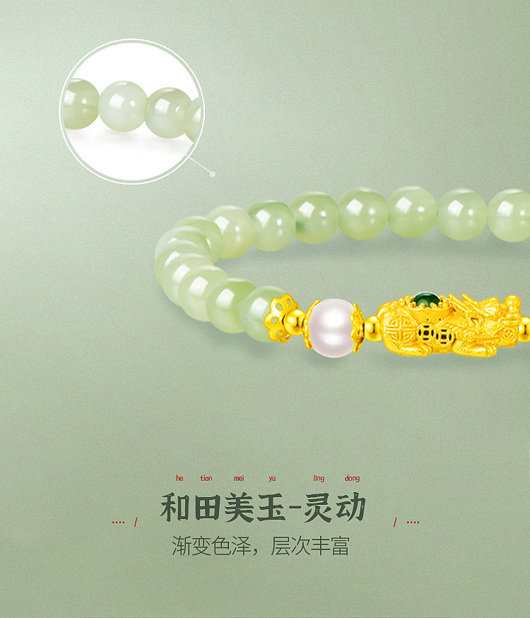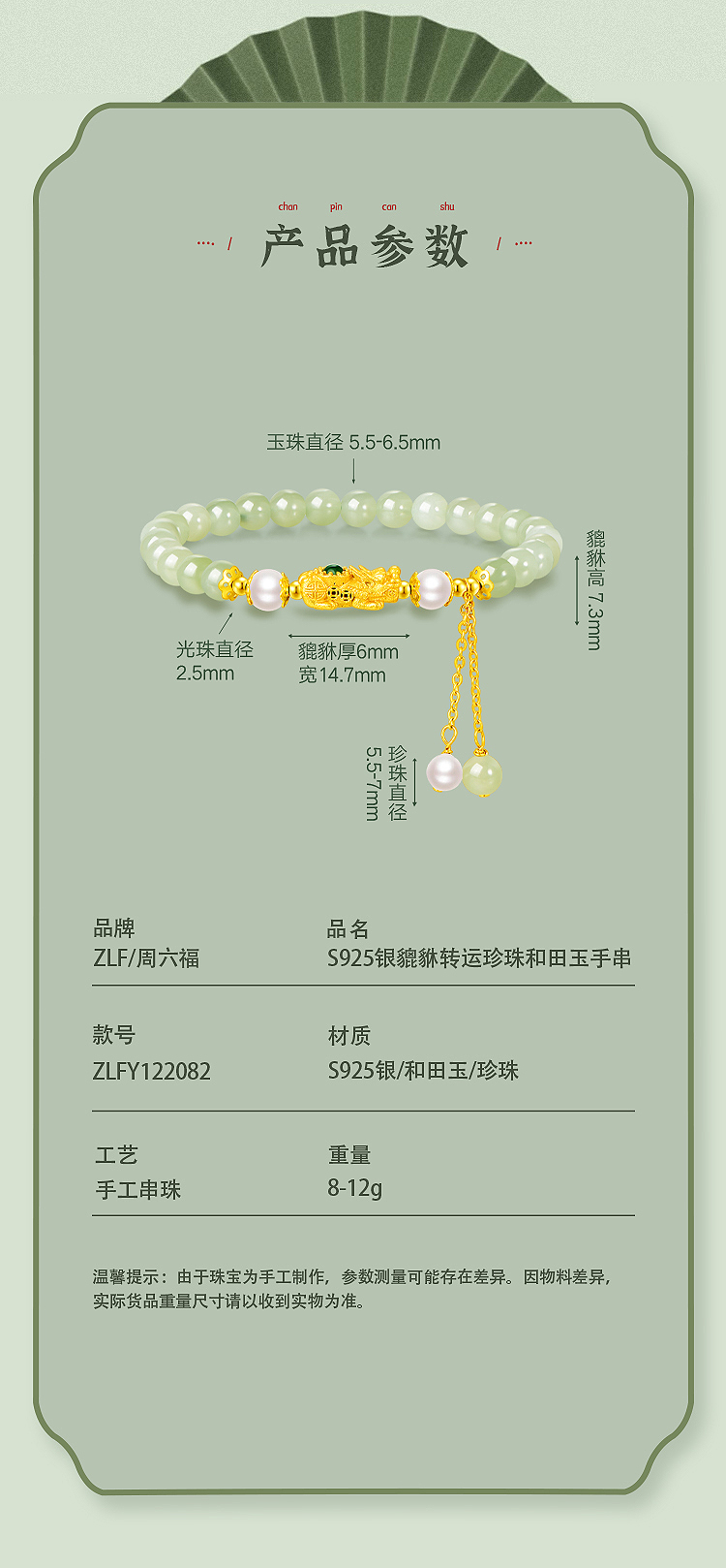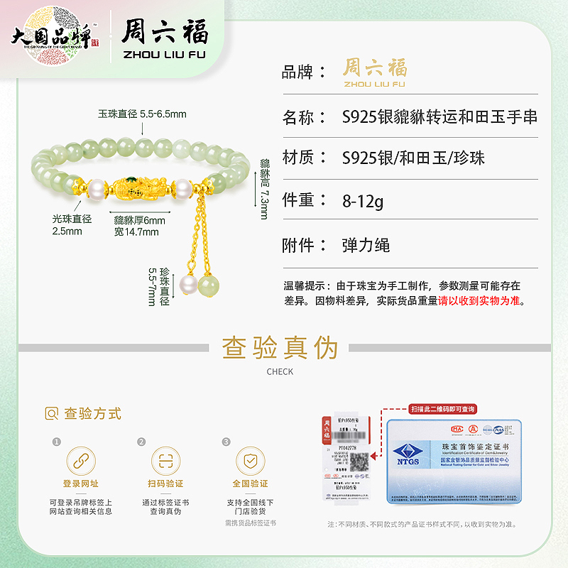 商品名称:周六福S925银貔貅转运珍珠和田玉手串ZLFY122082