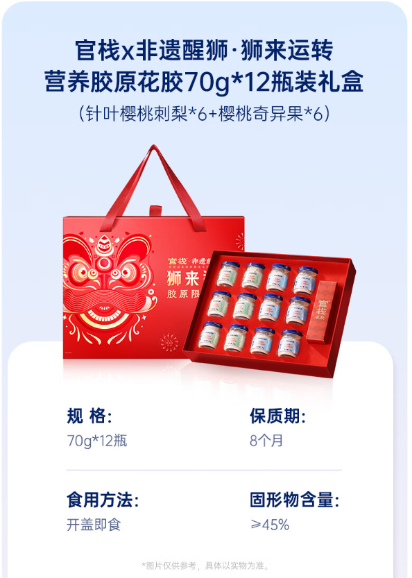 商品名称:【顺丰配送】官栈x非遗醒狮狮来运转营养胶原花胶礼盒840g