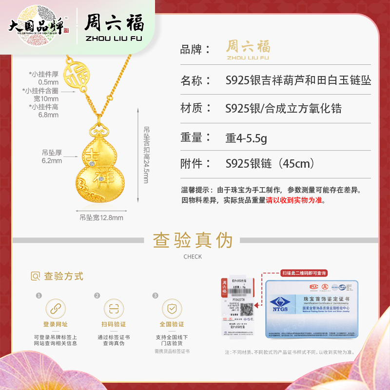 商品名称:周六福S925银吉祥葫芦和田白玉项链ZLFJ061575