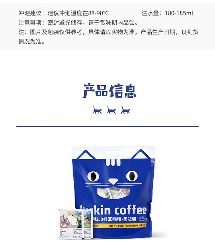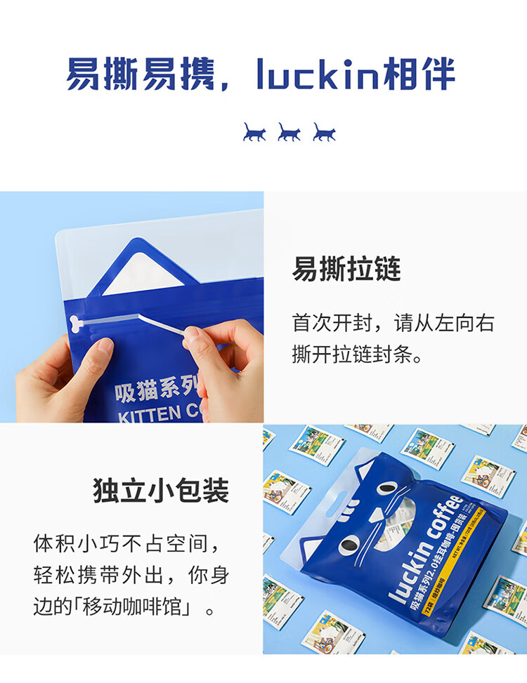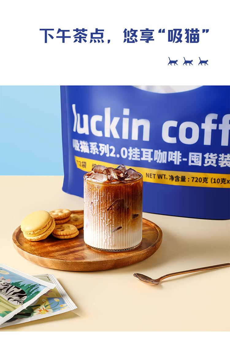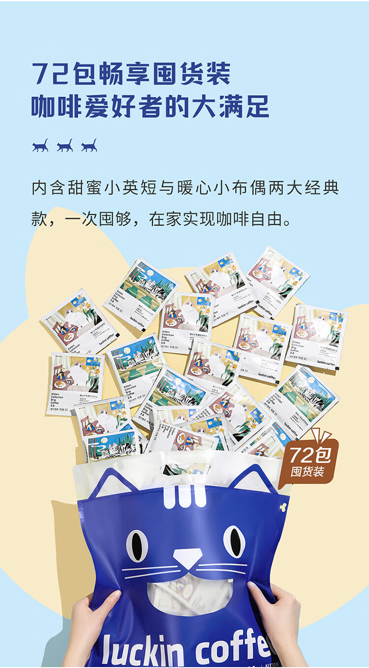商品名称:luckin coffee/瑞幸咖啡吸猫系列2.0挂耳咖啡囤货混合装72*10g袋RX0041